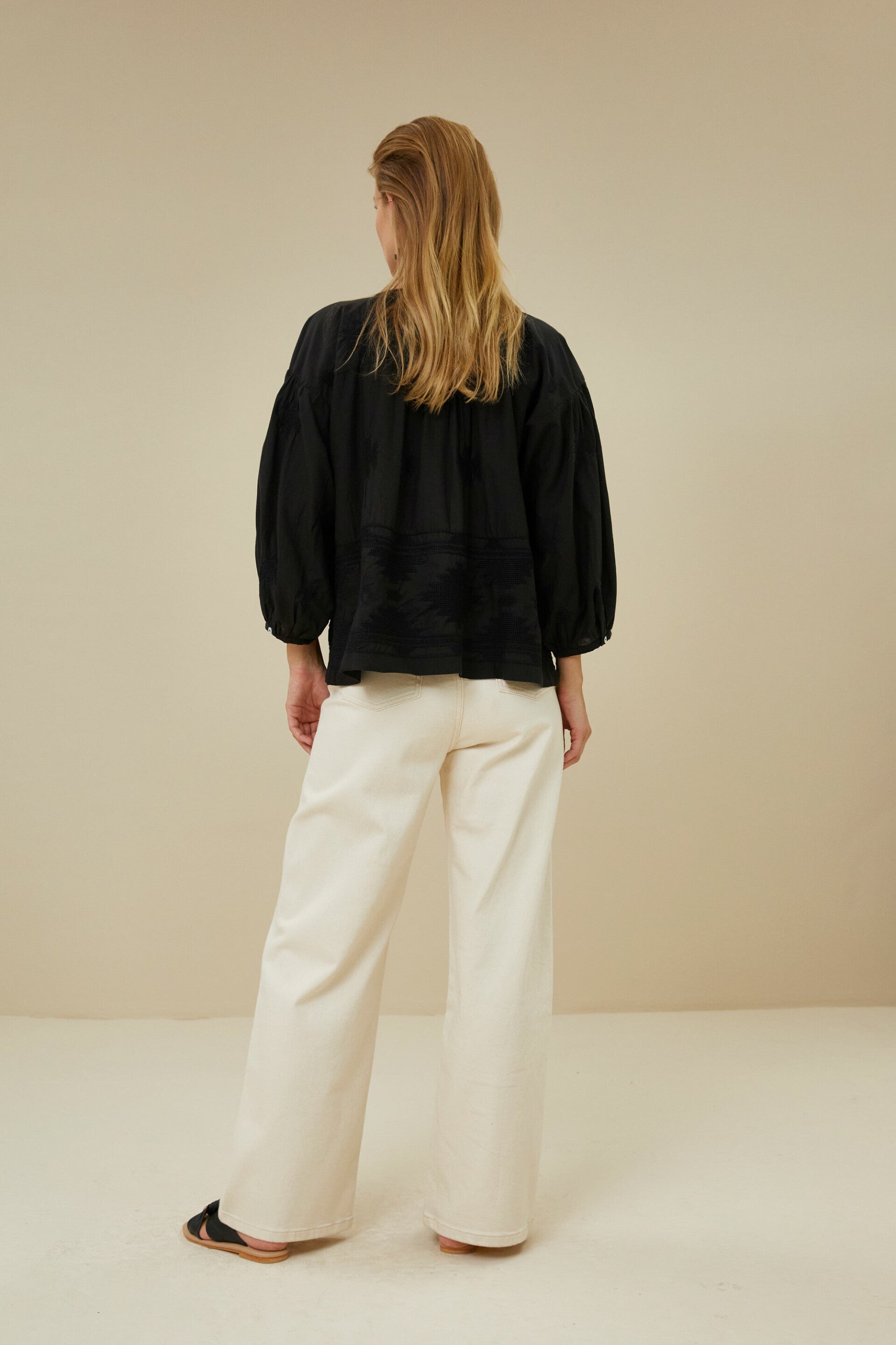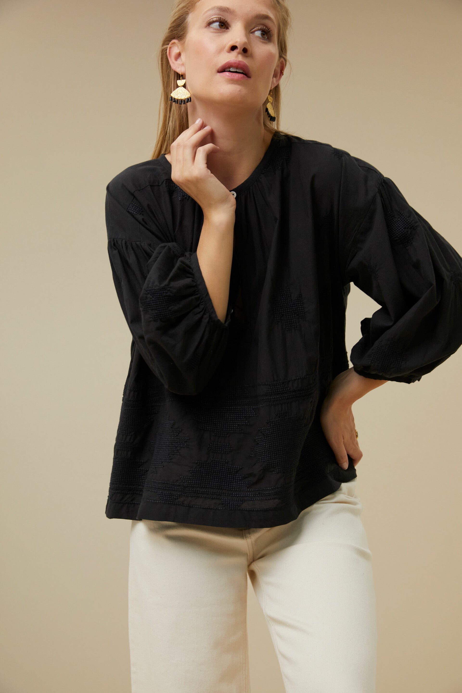 deze vrouwelijke blouse kan niet ontbreken in je garderobe. De blouse is gemaakt van een fijne 100% katoen kwaliteit. De driekwart mouwen hebben een poffend effect waardoor er extra volume ontstaat. De blouse heeft een ronde halslijn met plootje en knoopsluiting aan de voorzijde, daarbij is de blouse voorzien van romantische embroidery details.
