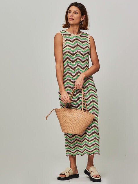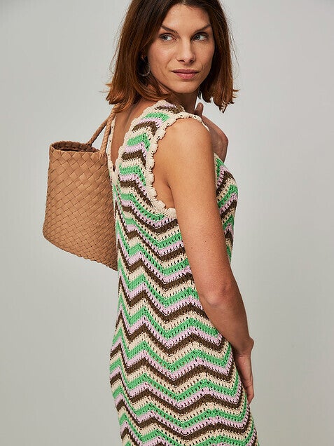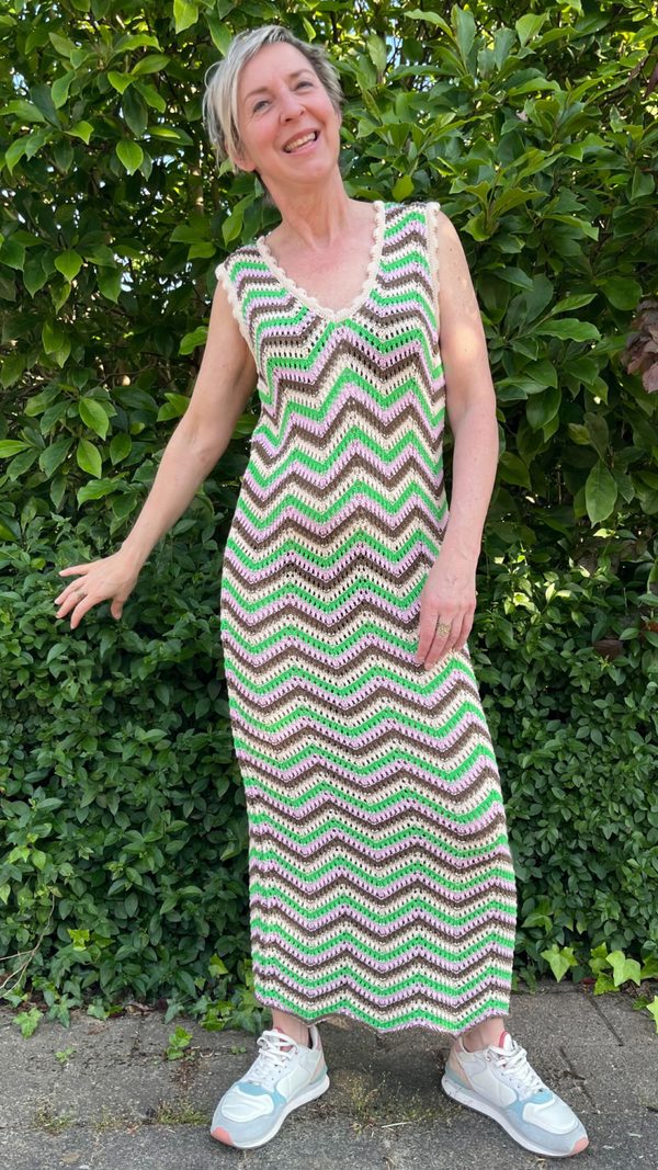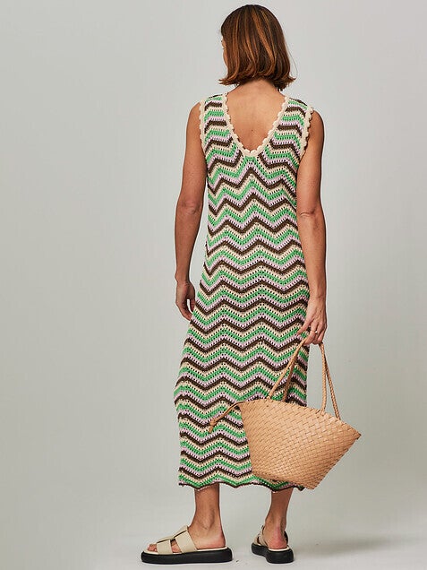 Lange mouwloze jurk van veelkleurig gehaakt biologisch katoen. De jurk heeft gedetailleerde biezen en een diepe v-halslijn aan de achterkant. Kan ook met de v-hals voorraan gedragen worden.