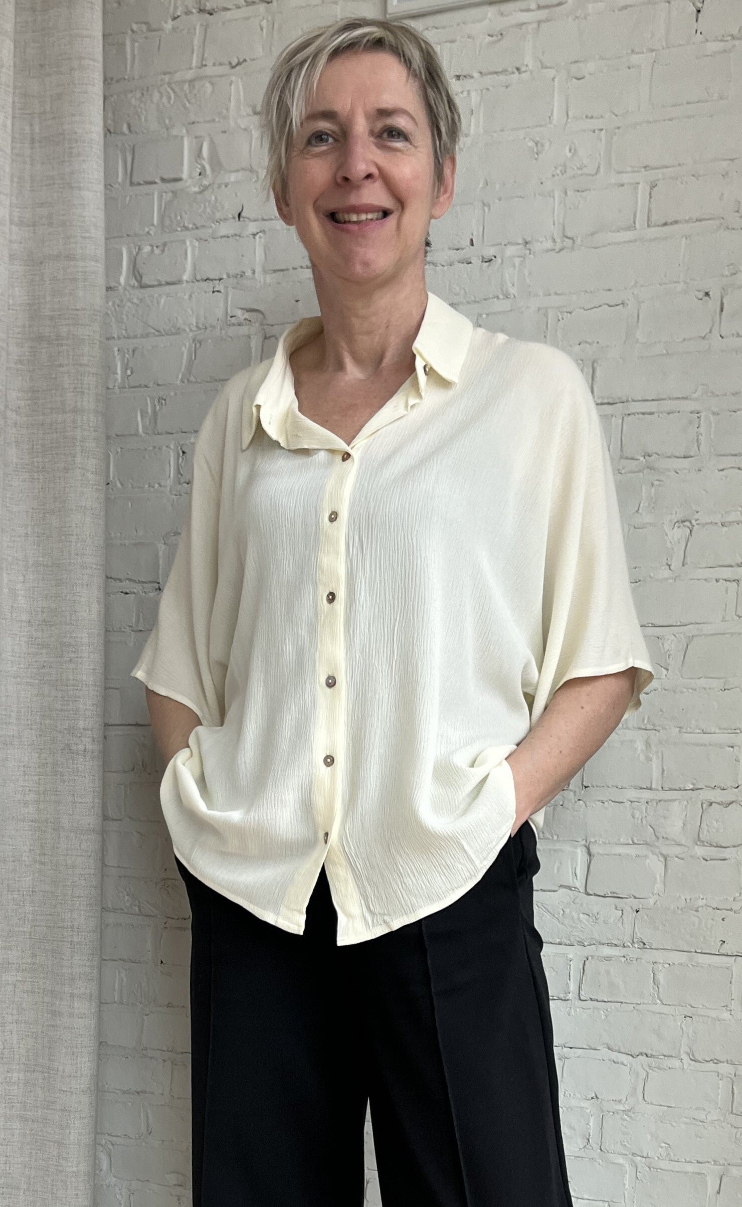 vanillekleurige oversized blouse met halflange mouwen