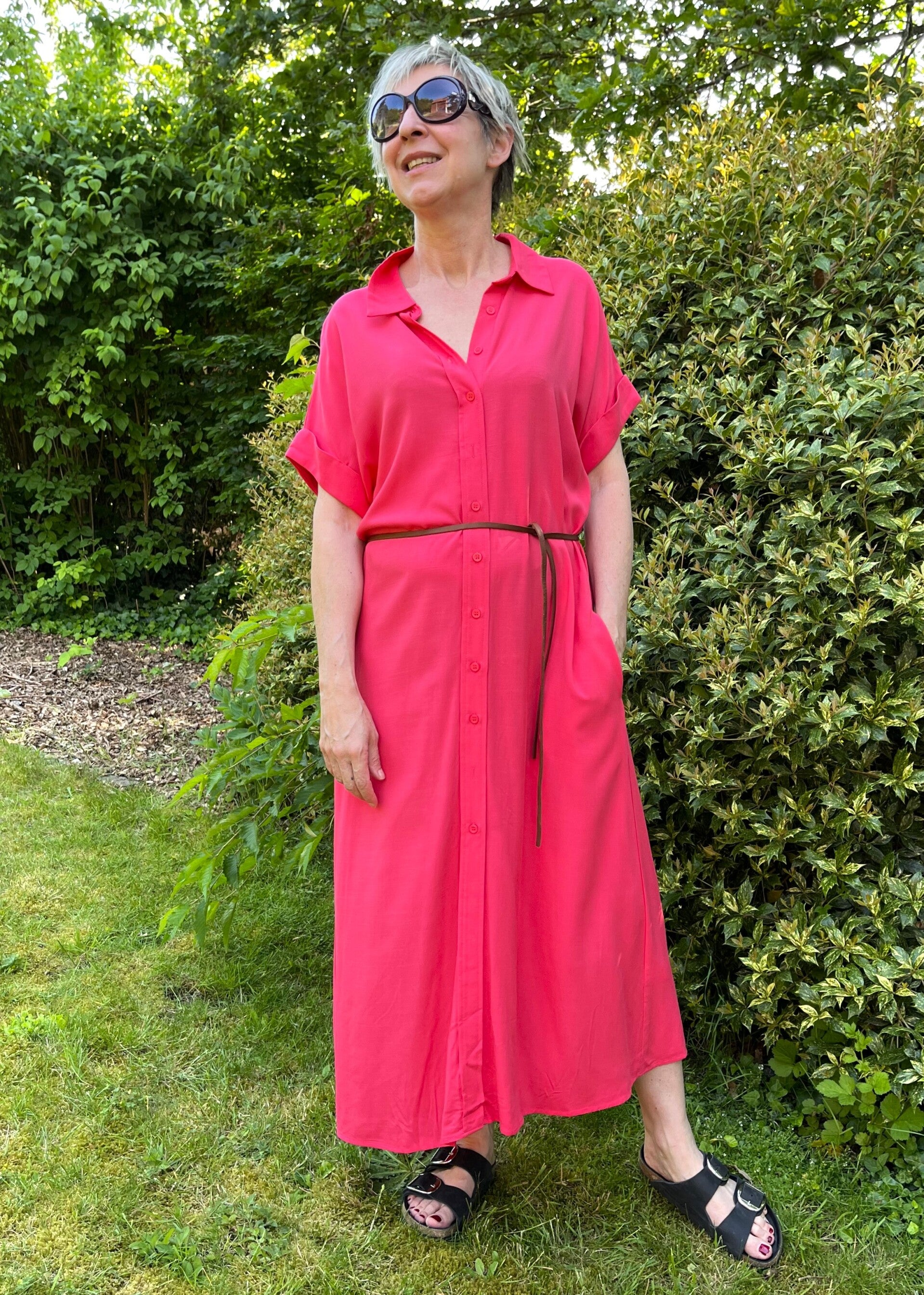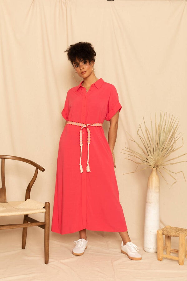 Deze zomerse koraalrode jurk kan je lekker los dragen of voor wie zijn taille liever wat in de kijker zet, met een riempje