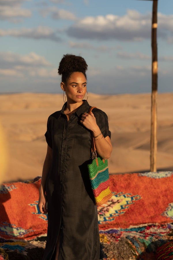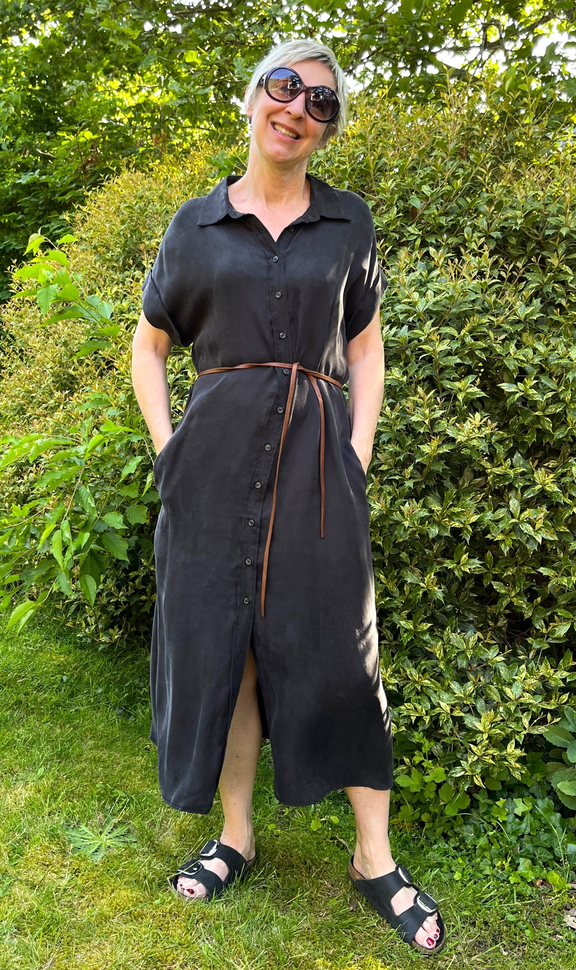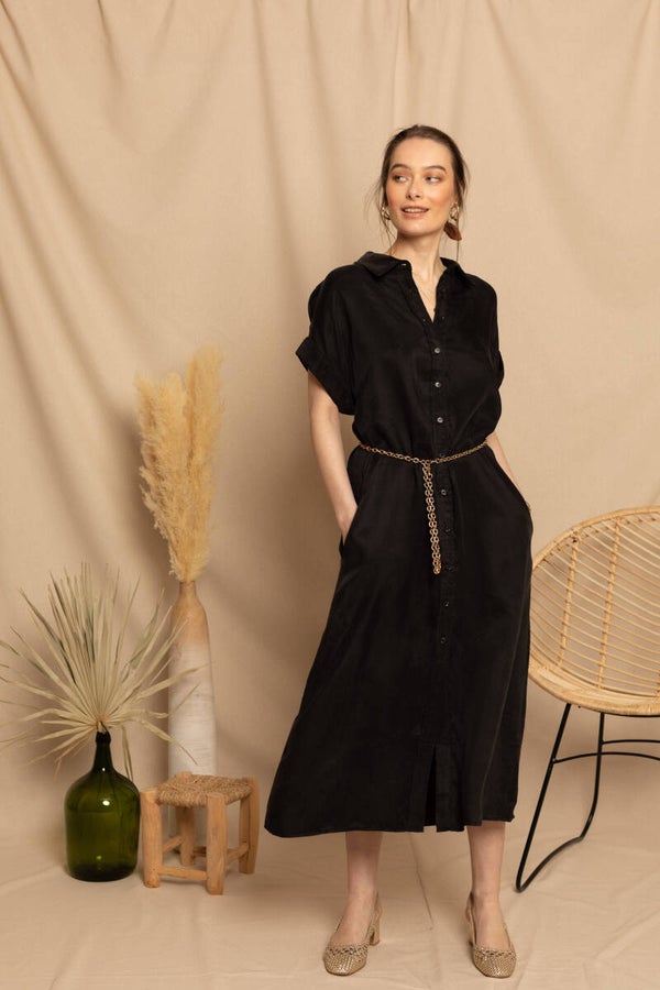 Deze zomerse zwarte jurk kan je lekker los dragen of voor wie zijn taille liever wat in de kijker zet, met een riempje