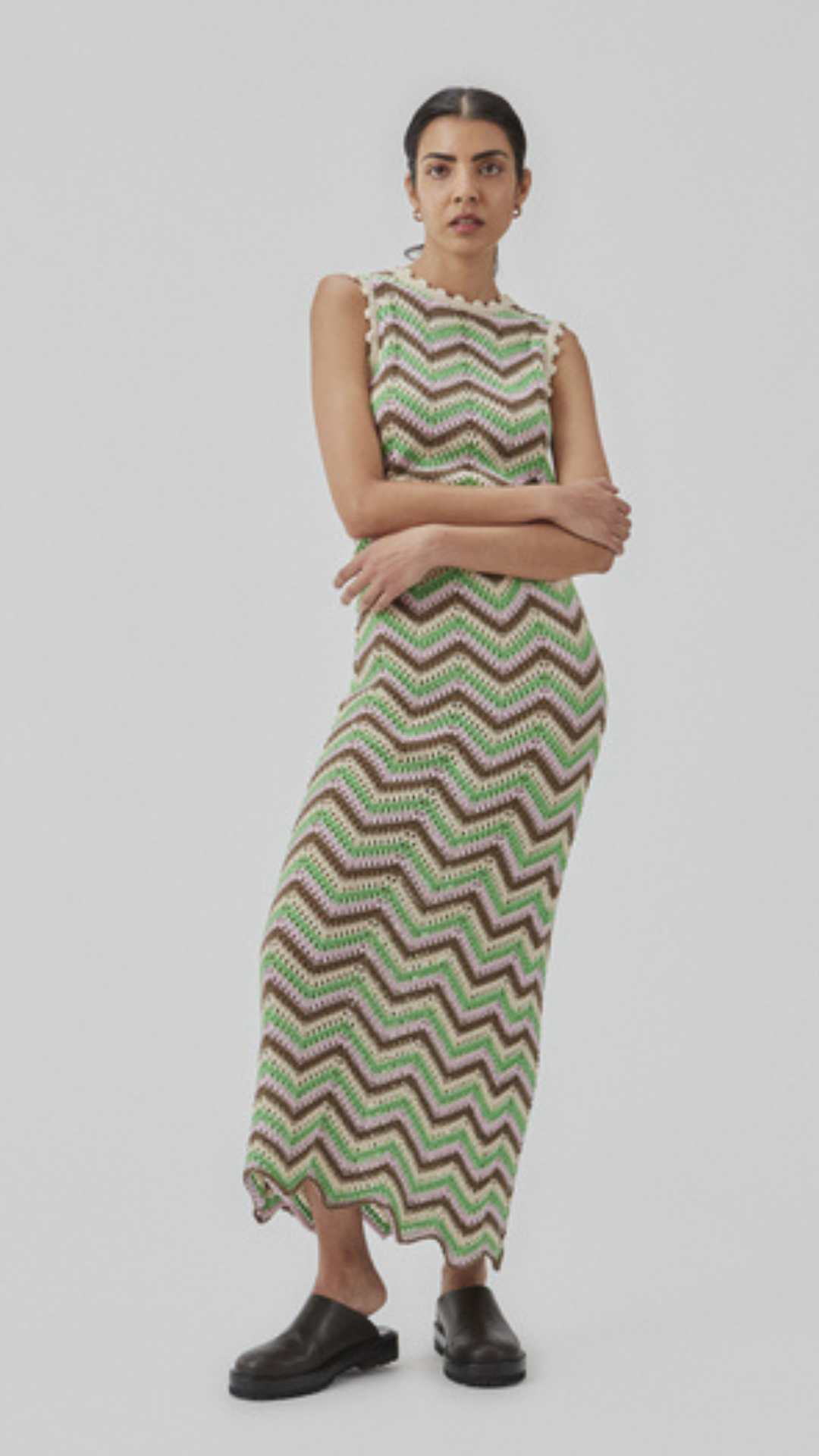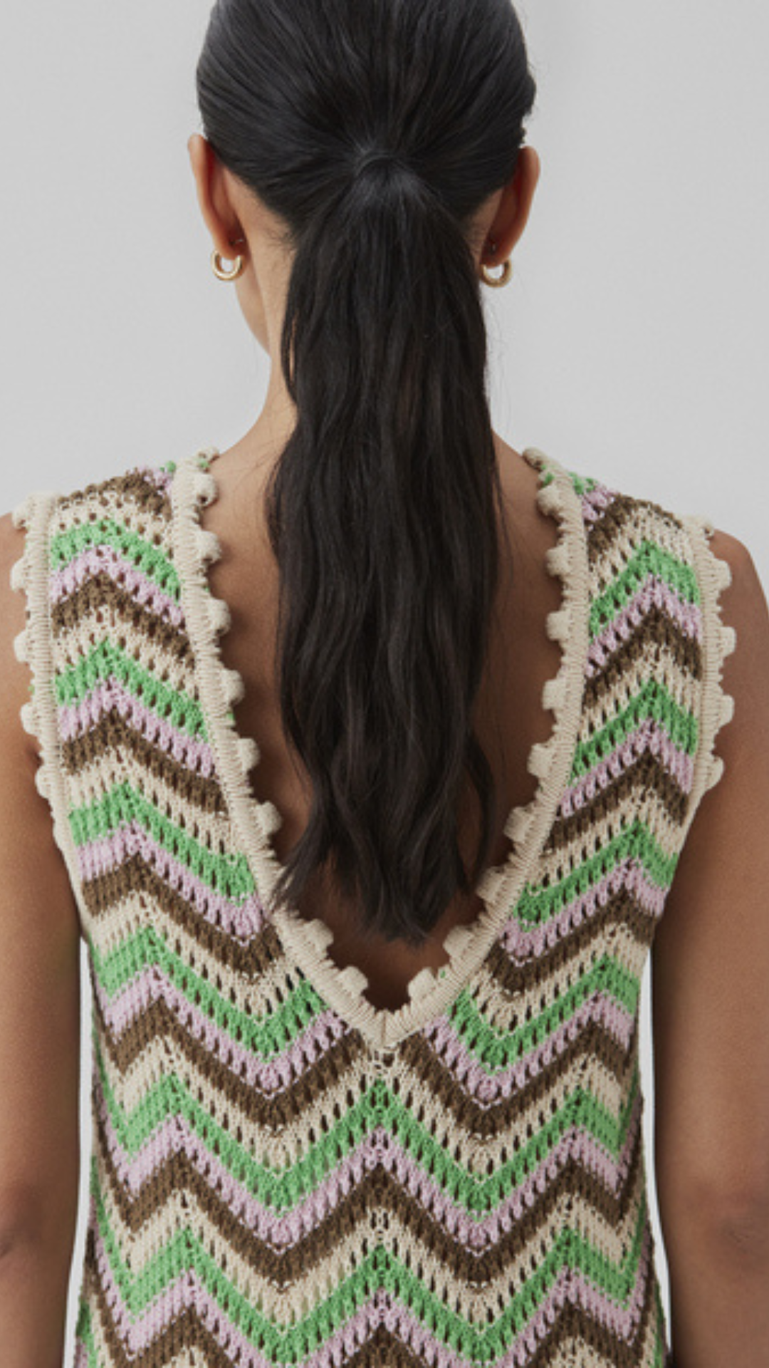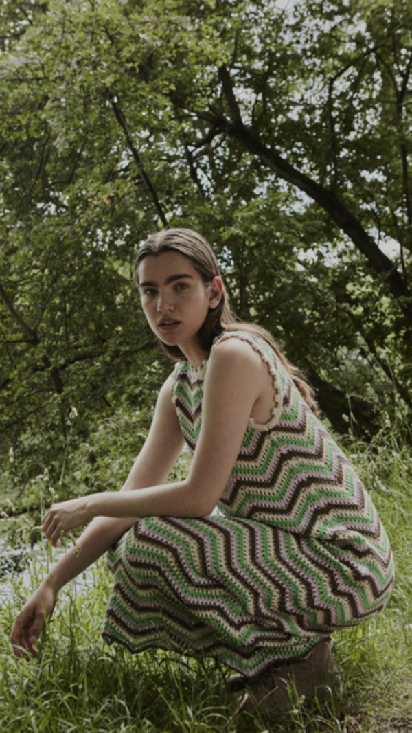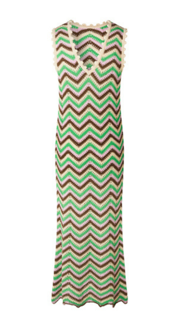 Lange mouwloze jurk van veelkleurig gehaakt biologisch katoen. De jurk heeft gedetailleerde biezen en een diepe v-halslijn aan de achterkant. Kan ook achterstevoren gedragen worden met de v-hals vooraan. Materiaal: 100% biologisch katoen