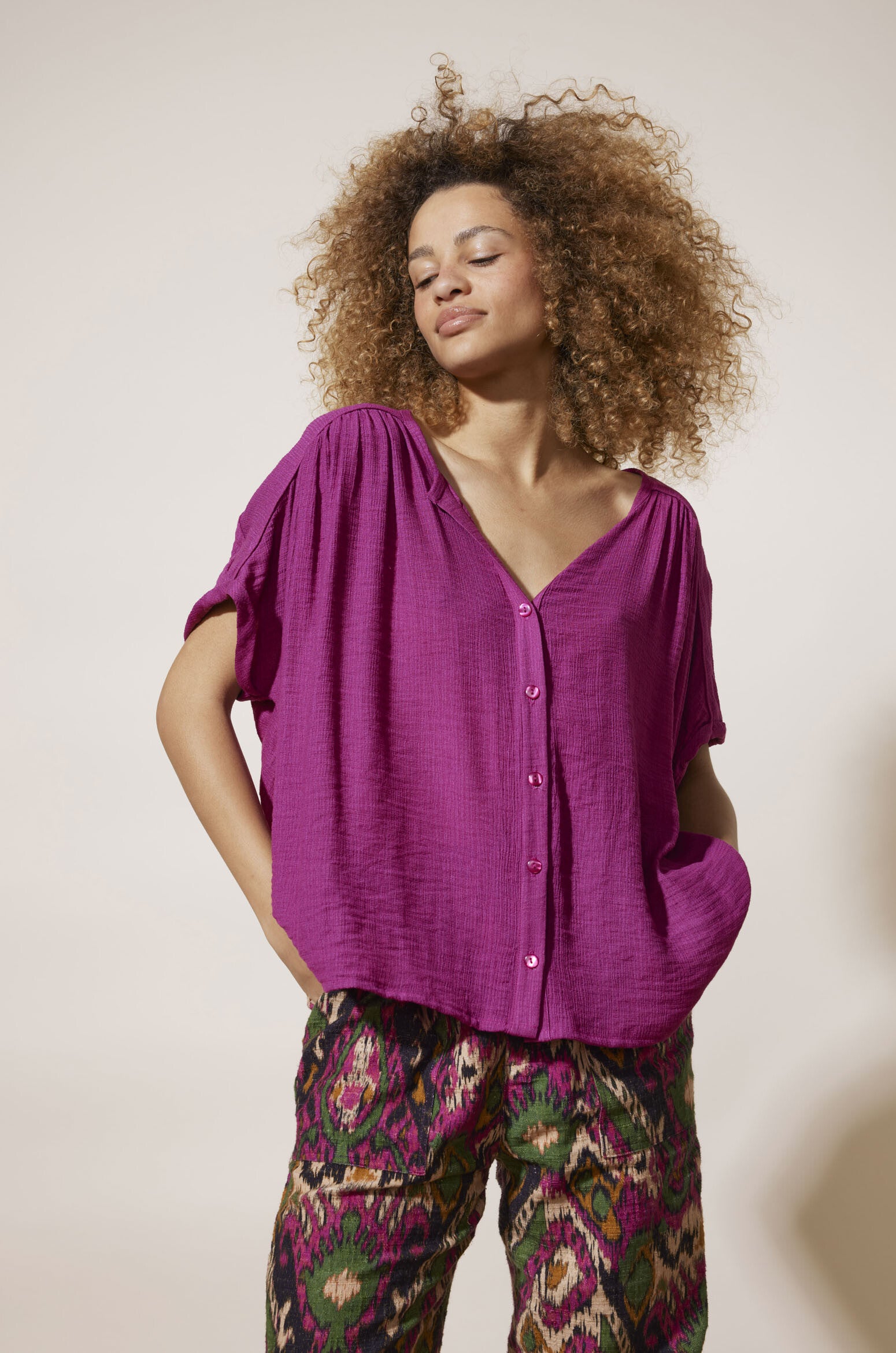 Soepelvallende top met knoopjes aan de voorkant in een prachtige kleurSamenstelling 83% viscose en 17% polyesterPasvorm: valt ruim