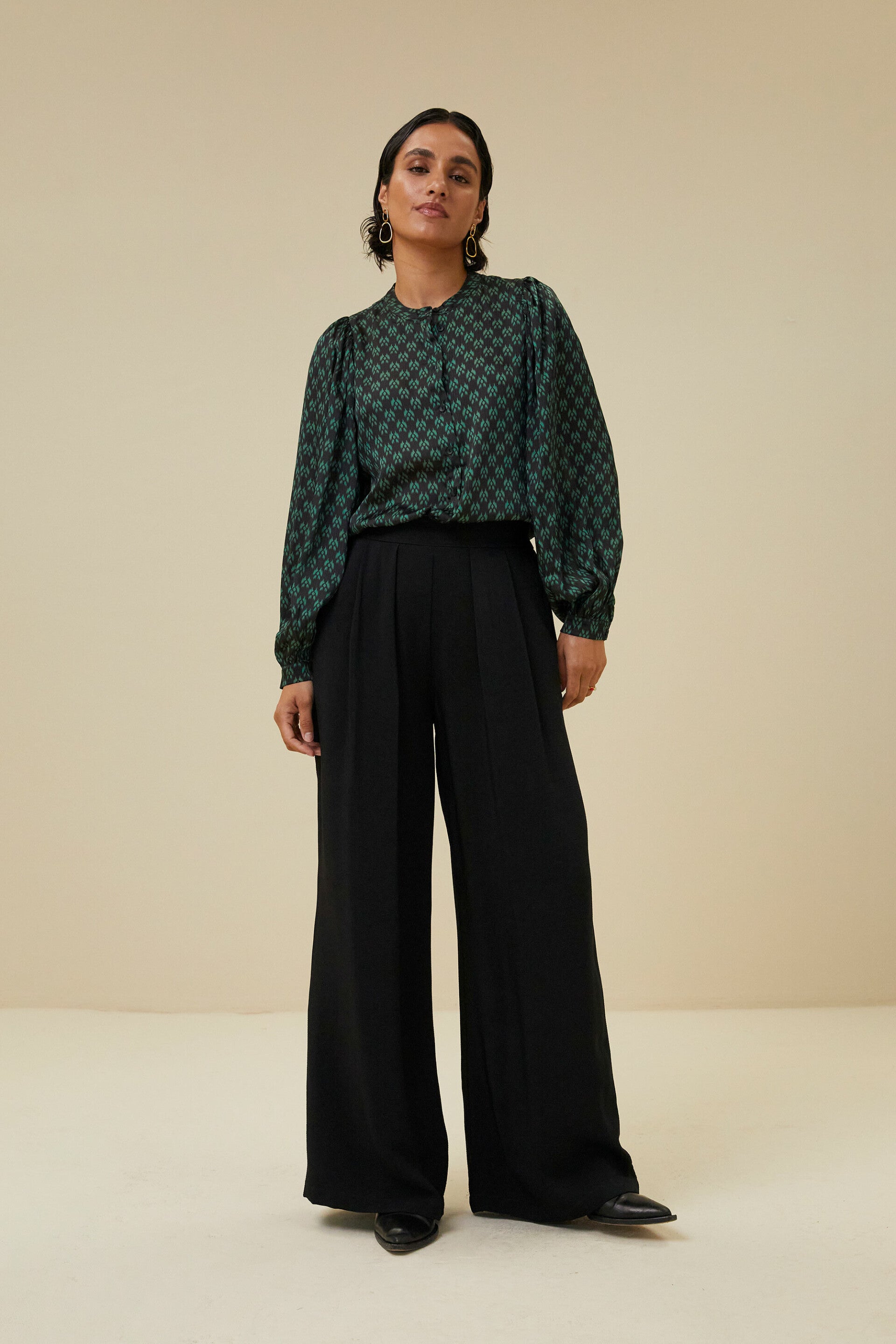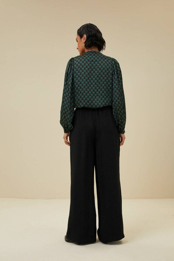 deze feminine blouse heeft een ronde halslijn, lange mouwen en een elegante print. De mouwen zijn voorzien van een knoopsluiting en daarnaast vallen de mouwen plooiend, dit zorgt voor een extra krachtige vrouwelijke touch. Combineer met je favoriete pant voor een elegante of juist casual look.