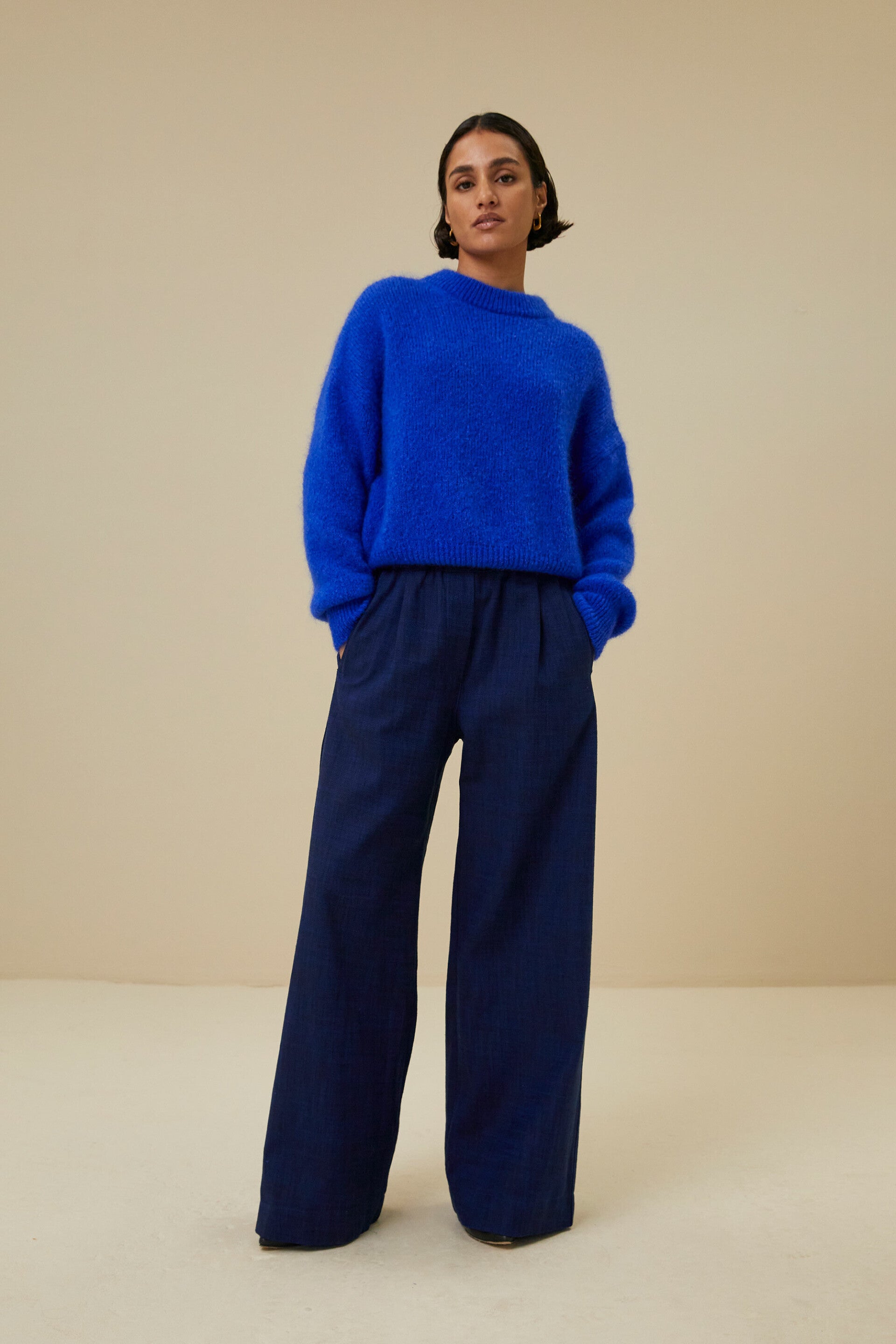 blauwe katoenen broek met wijde pijpen en elastische tailleband