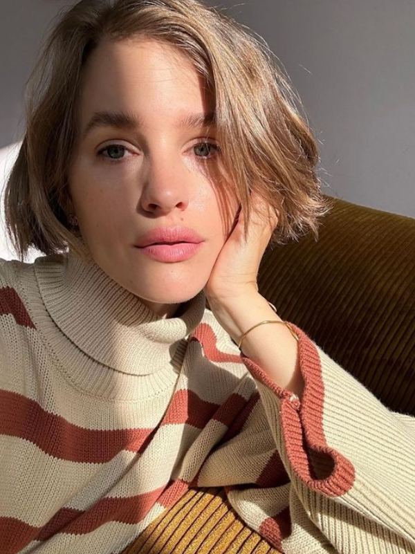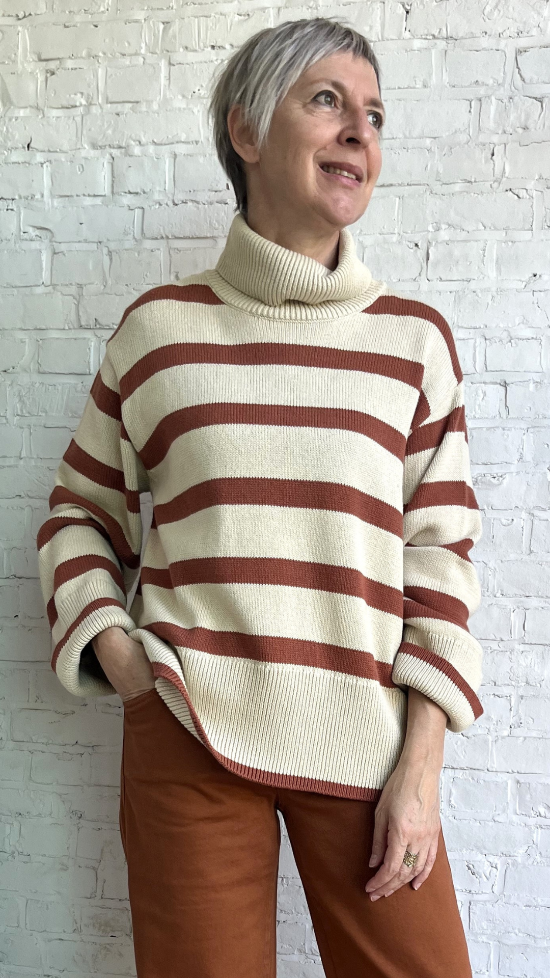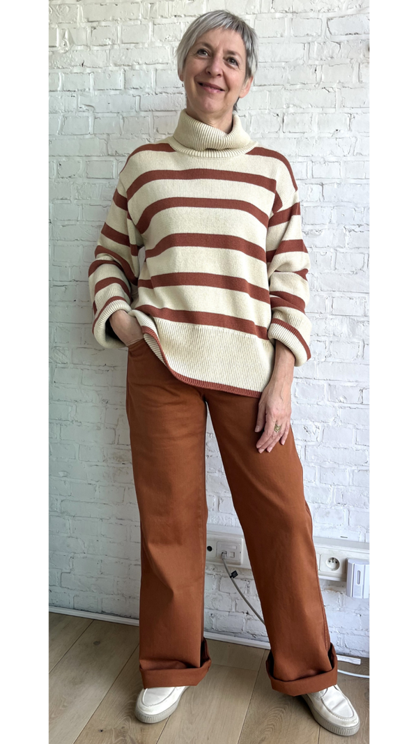 deze superzachte beige trui met bruine strepen is een echte blikvanger. De rolkraag zit lekker los rond je hals.