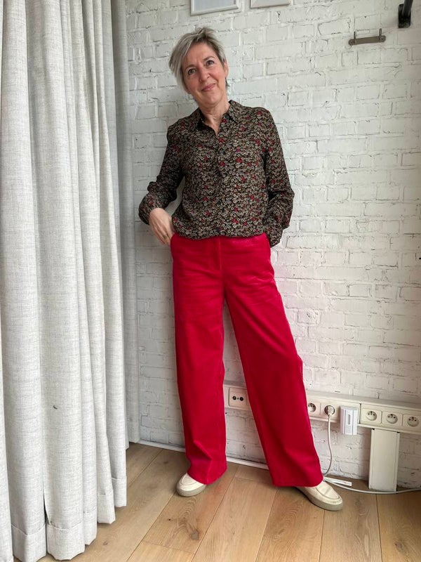 Deze donkerroze broek kan je voor iedere gelegenheid dragen. Ze is superzacht en heeft een elastische tailleband op de rugzijde. Ook beschikbaar in beige en donkerblauw