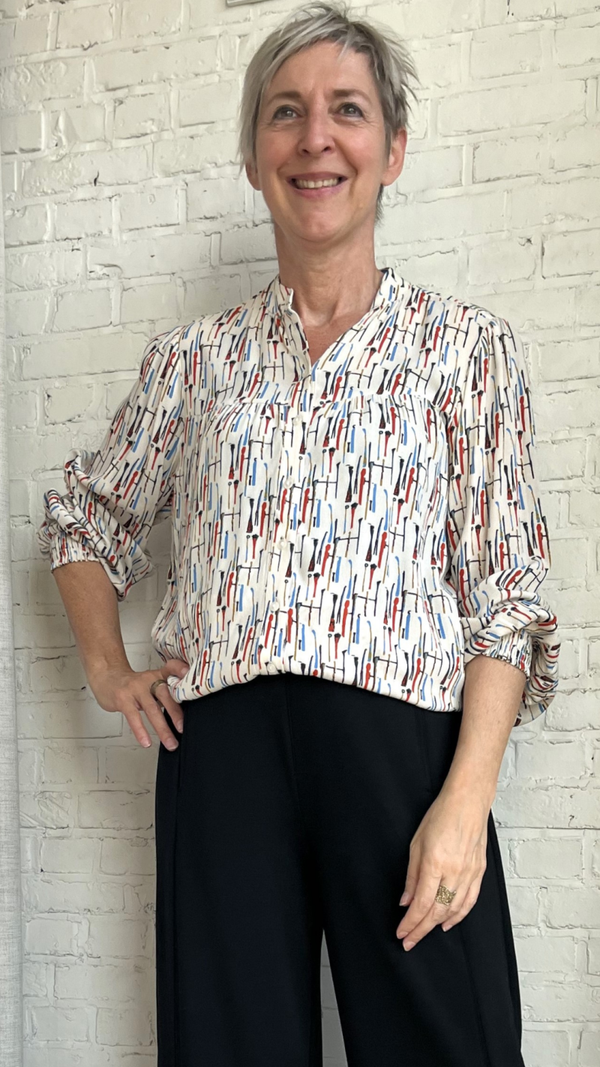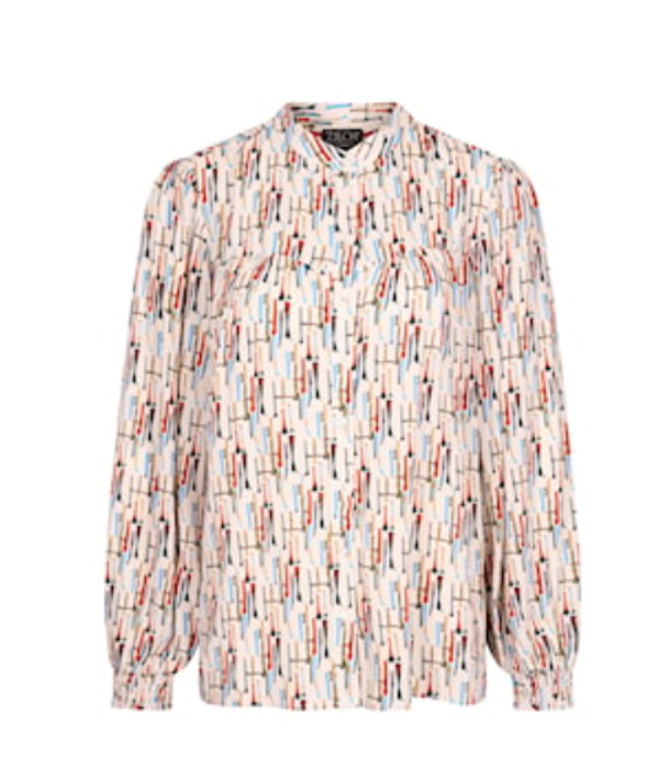 Stijlvolle blouse met knoopsluiting en korte opstaande kraag in prachtige print. Dit losser vallende model is gemaakt van zachte rayon chiffon en heeft wijde mouwen met gesmokt manchet.
