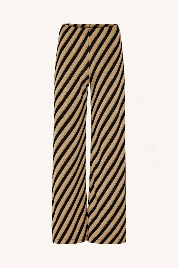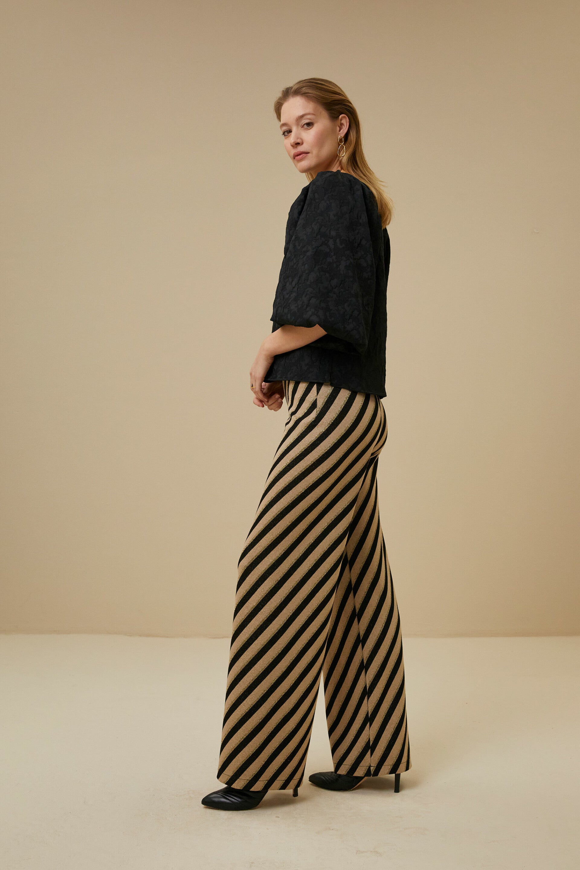 De broek is gemaakt voor zwel een elegante als casual look. De broek heeft een hoge taille en een rechte pasvorm. Verder heeft de broek een elastische tailleband en als finishing touch is ze voorzien van een gestreept lurex dessin wat zorgt voor een feminine touch.