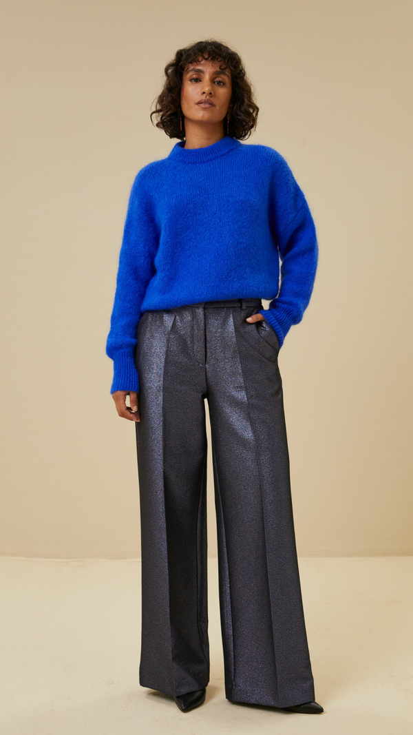 Deze subtiele blauwe glitterbroek heeft een elegante look and feel. De broek is gemaakt van een mooie blend van viscose en polyester en is gecombineerd met elastaan voor een optimale pasvorm. De broek kenmerkt zich door een blinde ritssluiting en twee steekzakken aan de bovenzijde. Een echte feestelijke klassieker & klaar voor jouw favoriete look!