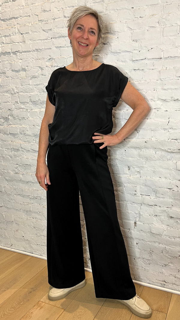 deze zwarte top met boothals is een echtte topper. De top heeft een lichtglanzende stof, waardoor je hem zowel casual als feestelijk kan stylen.