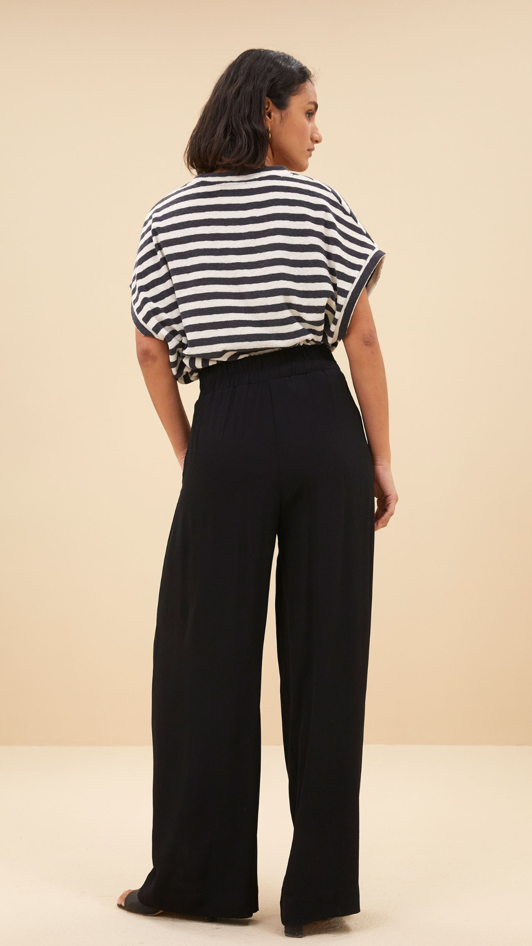 creëer moeiteloos een nonchalant-chique look met deze tijdloze zwarte broek. de broek is gemaakt uit een hoogwaardige viscose en heeft een relaxte pasvorm. Afhankelijk van de schoenen die je draagt, creëer je een casual of chique look. De broek heeft een elastische taille.