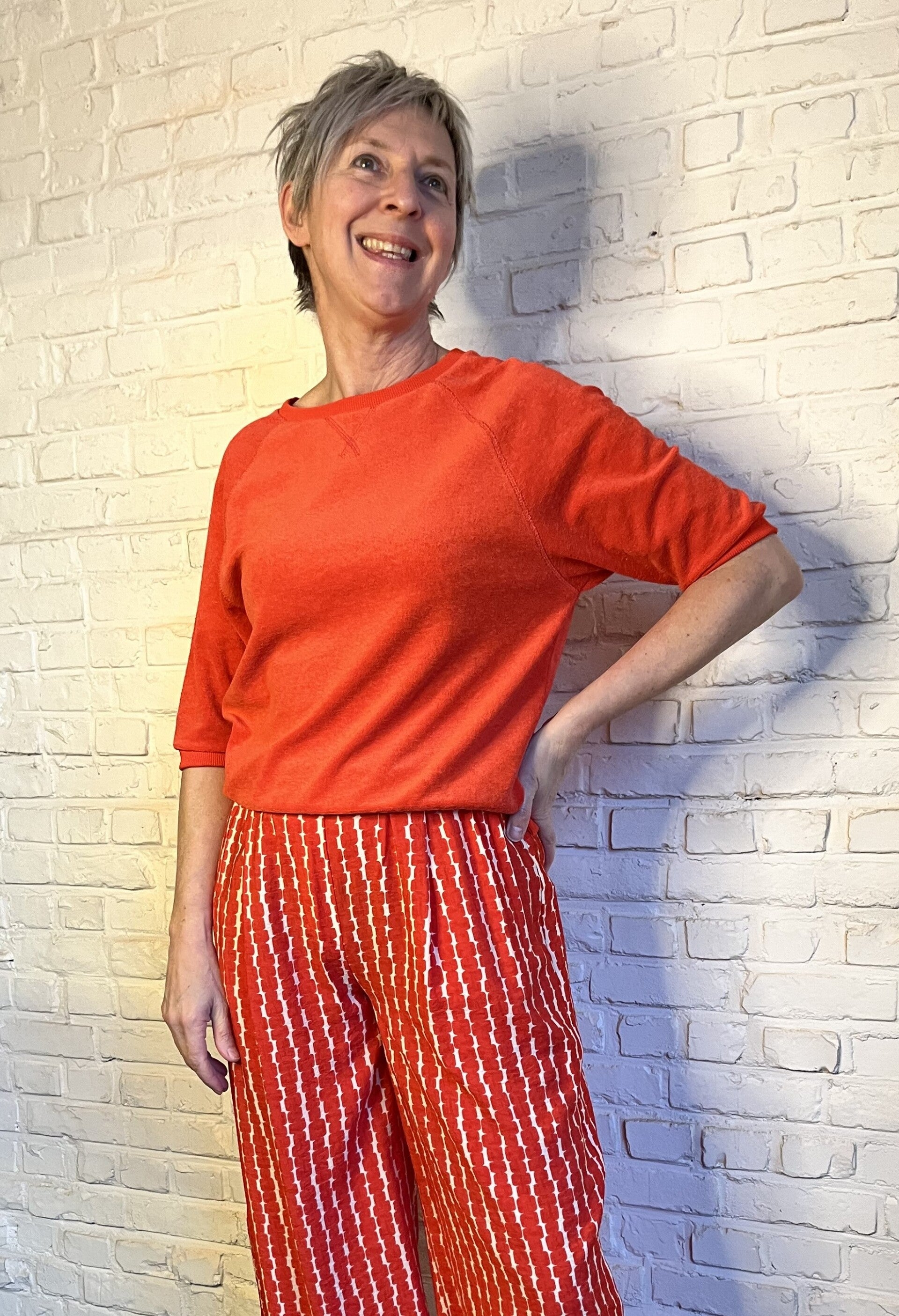 Comfortabele sweater met een ronde halslijn en korte mouwen die iets langer vallen dan normaal. De top is afgewerkt met een ribboord aan zowel de onderkant van de mouwen als aan de onderkant van de top; daarbij zit er een splitje aan beide zijkanten van de top. Hij is gemaakt van een fijne blend van organic katoen en gerecycled polyester en is een echte must-have essential.