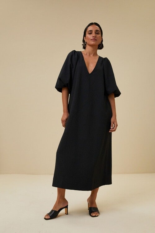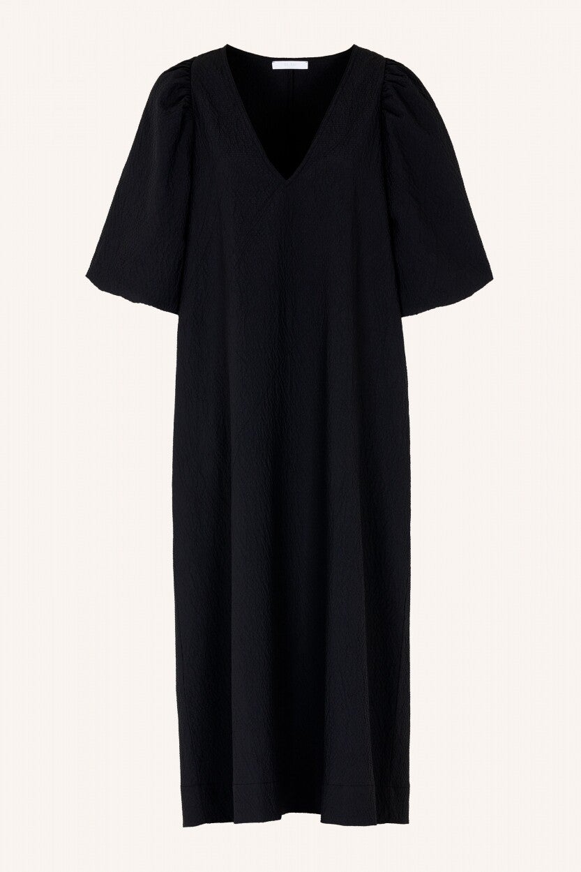 Deze jurk is gemaakt van een blend met gerecycled polyester, heeft pofmouwen, structuur, een elegante v-halslijn en een maxi lengte. Kortom elegantie on top en een echte one-piece design.