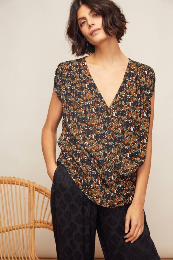Mouwloos t-shirt met V-hals, biesdetail bij de armsgaten, plooitjes op de borst