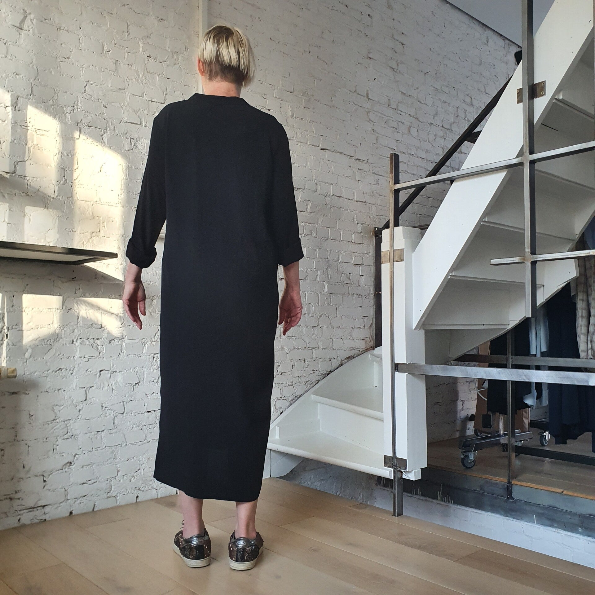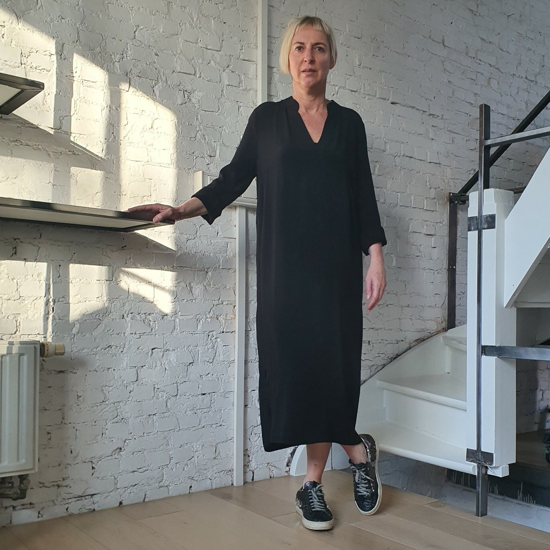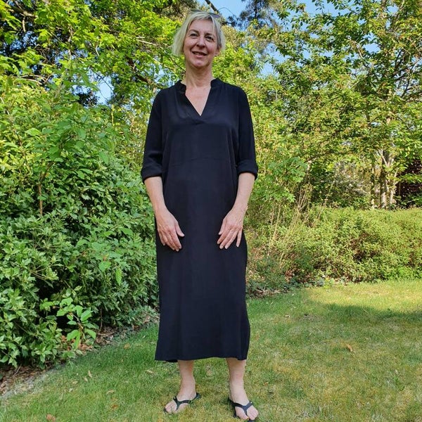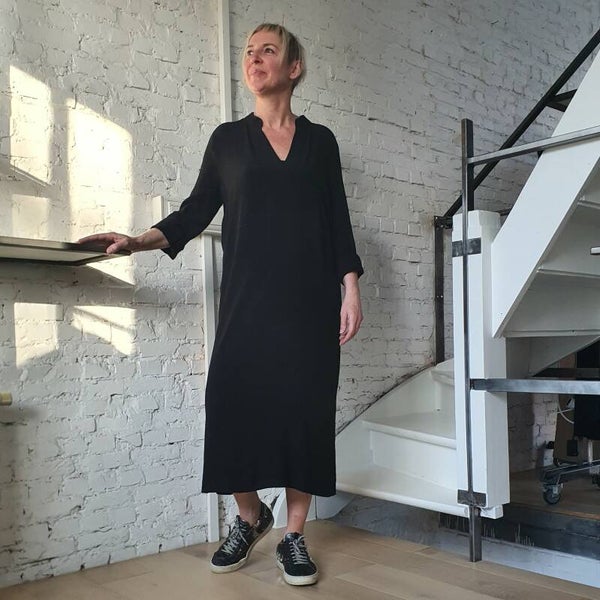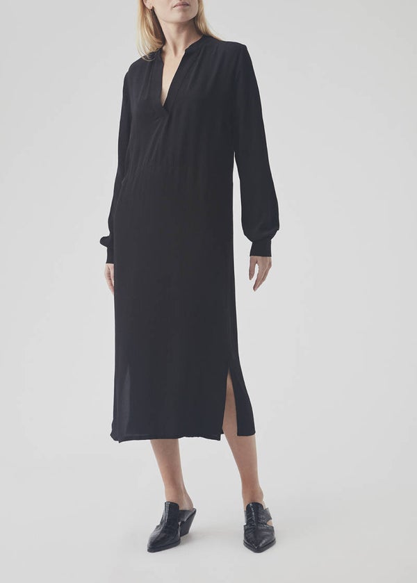 Eenvoudige jurk in een mooie viscose kwaliteit. Deze jurk heeft een midi lengte en heeft een losse pasvorm. De jurk heeft een v-hals en brede manchetten aan de mouwen, wat karakter geeft aan het ontwerp.
