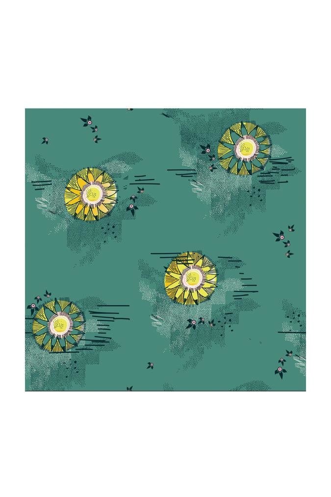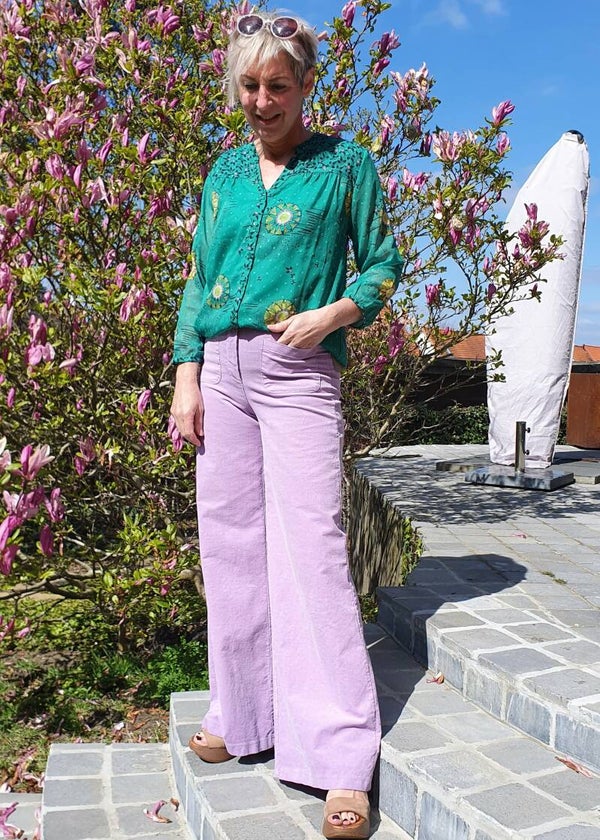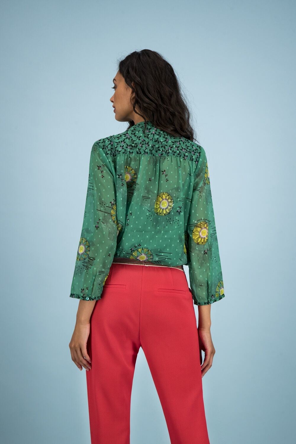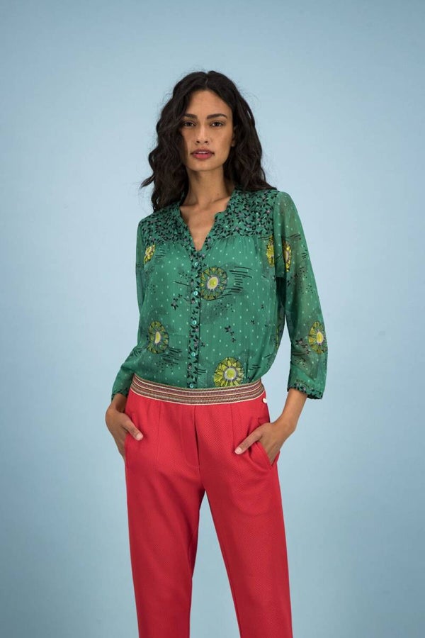 Deze groene blouse heeft een print met zonnetjes die is gebaseerd op Katja Schuurmans verhalen over geluk. Deze Kissed by the Sun print is handgeschilderd en in-house ontworpen door de POM-zussen. De blouse is gemaakt van een fijne zachte stof en heeft lange mouwen en een V-hals met knoopjes aan de voorkant.