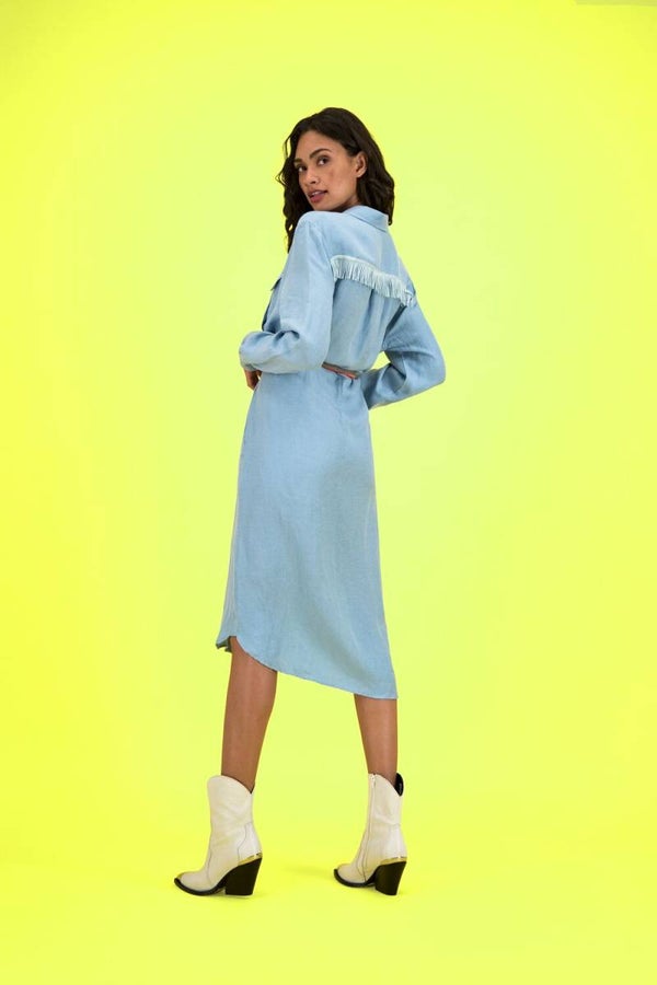 Deze linnen midi-jurk kun je op verschillende manieren dragen door de twee ceinturen die met deze jurk komen. De ene ceintuur heeft een lichtblauwe/oranje kleur en de andere een rode/lichtroze kleur. De franjes die op de rug zitten geven een extra detail aan deze lichtblauwe jurk. Verder heeft het zomerse jurkje borstzakken aan beide kanten en lange mouwen.
