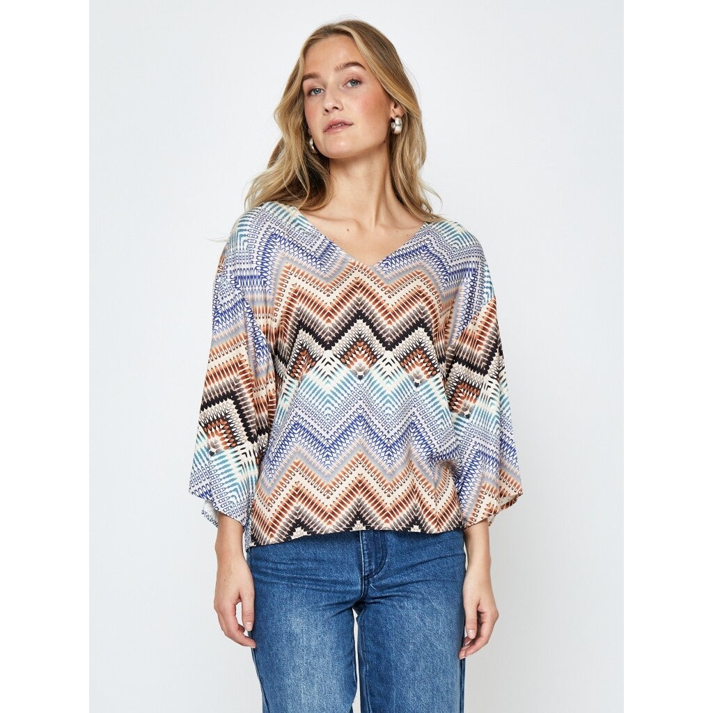 zomers blousje met zigzagmotief en v-hals. De blouse heeft 3/4 mouwen