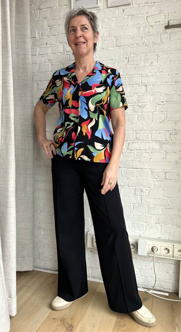 Fijne rechte blouse van soepele ecovero viscose in kleurrijke prints. De blouse heeft een reverskraag, knoopsluiting en korte mouwen.