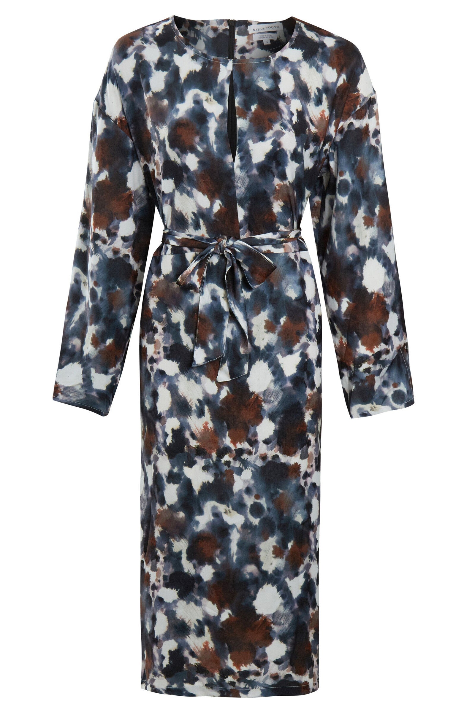 Zachte stoere jurk met een eigentijdse variant op de panterprint. Deze originele variant combineert wit met blauwpaarse tinten.