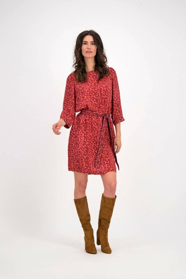 Deze jurk met driekwart mouwen heeft een print van bordeaux rode vlekjes op een oranje ondergrond. De jurk is gemaakt van cupro waardoor hij soepel valt en als zijde aanvoelt. De jurk heeft een ronde hals en valt tot net boven de knie. Om de taille zit een ceintuur afgewerkt met een zwarte piping.