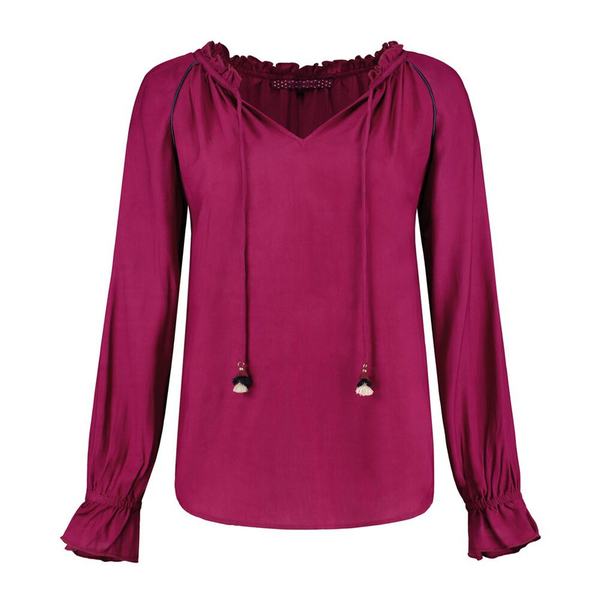 Prachtige fuchsia blouse in dunne soepelvallende stof. Aan de hals zitten koordjes met een speels kwastje100% Viscose