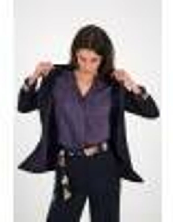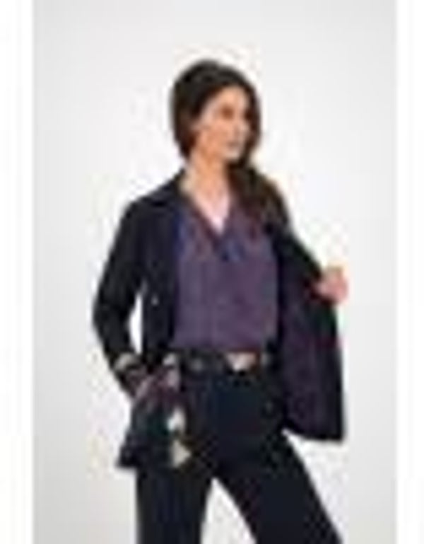 Een comfortabele donkerblauwe blazer met mooie details: high-end knopen en kleurrijke kwastjes; subtiele gouden bies langs beide zakken. Op de mouwen zit een mooie print die omgeslagen kan worden. De blazer heeft een stijlvolle voering in panterprint