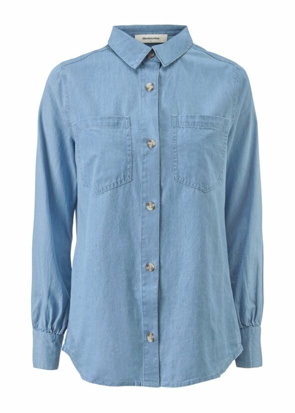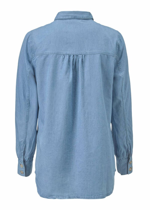 Cool overhemd in chambray. Het soepele jeans heeft een brede manchet op de mouw en grote knopen aan de voorkant. Het shirt is van een mooie katoenkwaliteit.100% katoen
