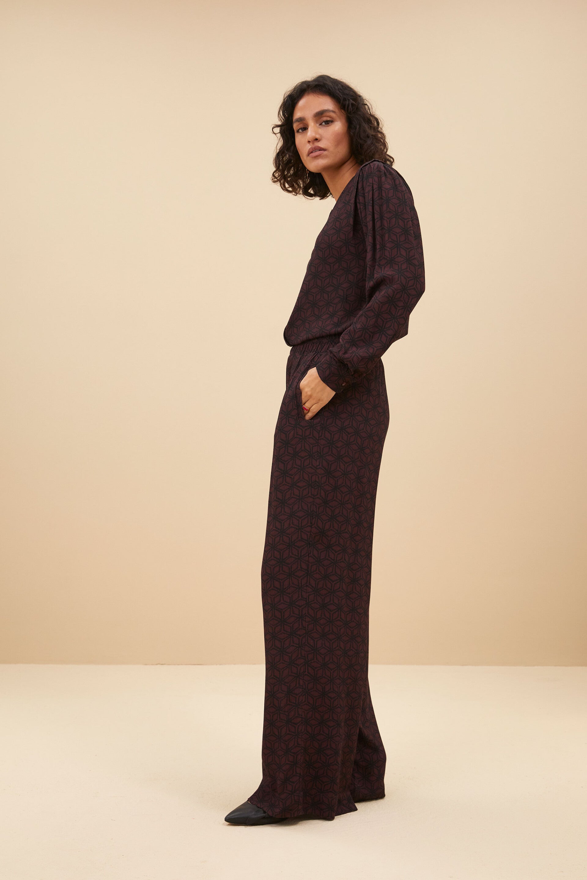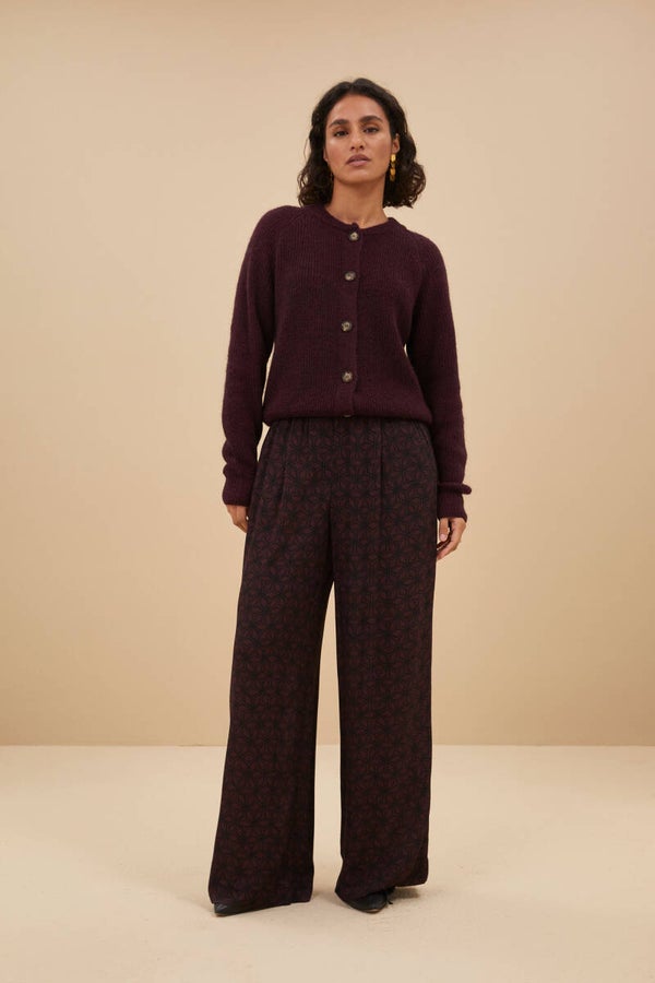 plumkleurige broek met zacht print
