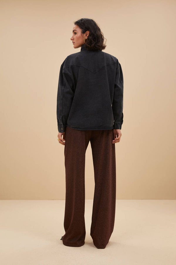 koperkleurige glitterende broek met elastische taille