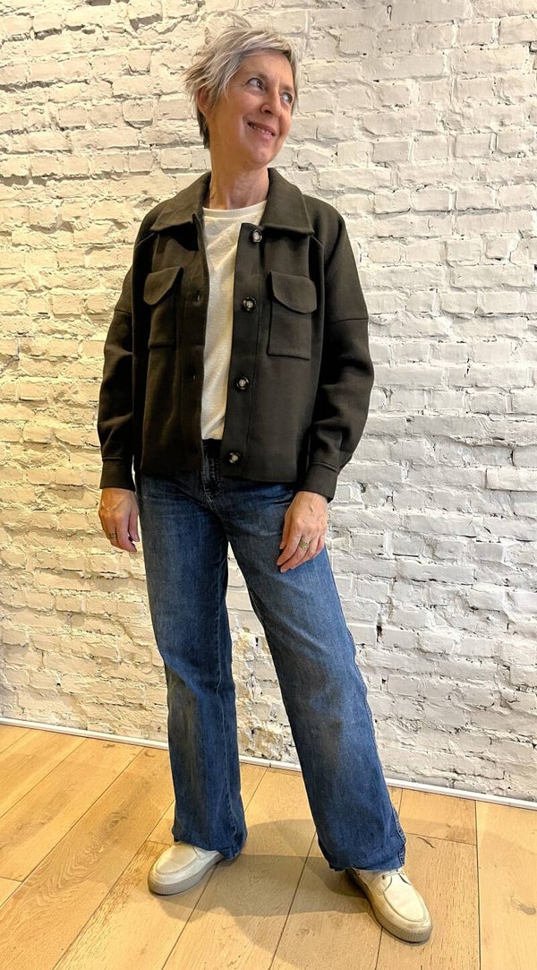 Deze kaki hippe topper in stretchstof kan je zowel buiten als vest dragen en binnen als cardigan. de vest heeft 2 zakken op de borst en is achteraan ietsje langer dan vooraan