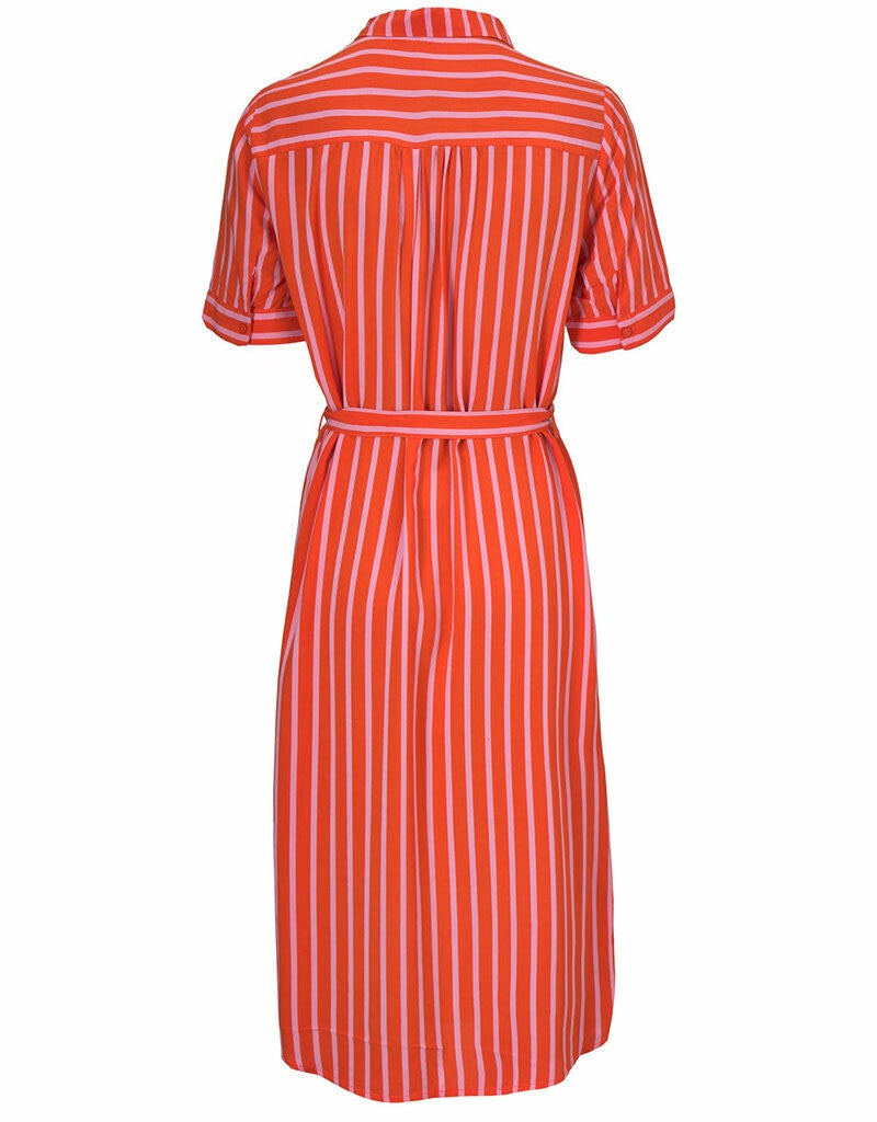 Vrouwelijke jurk met gestreepte print. De jurk heeft een midi-lengte en korte mouwen. Hij heeft een knoopsluiting aan de voorkant, een kleine kraag en een ceintuur in de taille, wat voor mooie accenten zorgt.