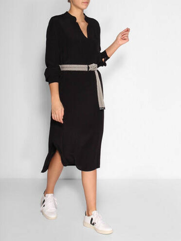 Simpel donkerblauw midikleed. Losse fit met v-hals en brede manchetten bij de mouwen, wat extra detail geeft aan het kleedje. Je kan nooit genoeg donkere kleedjes in jouw garderobe hebben, dus waar wacht je nog op?