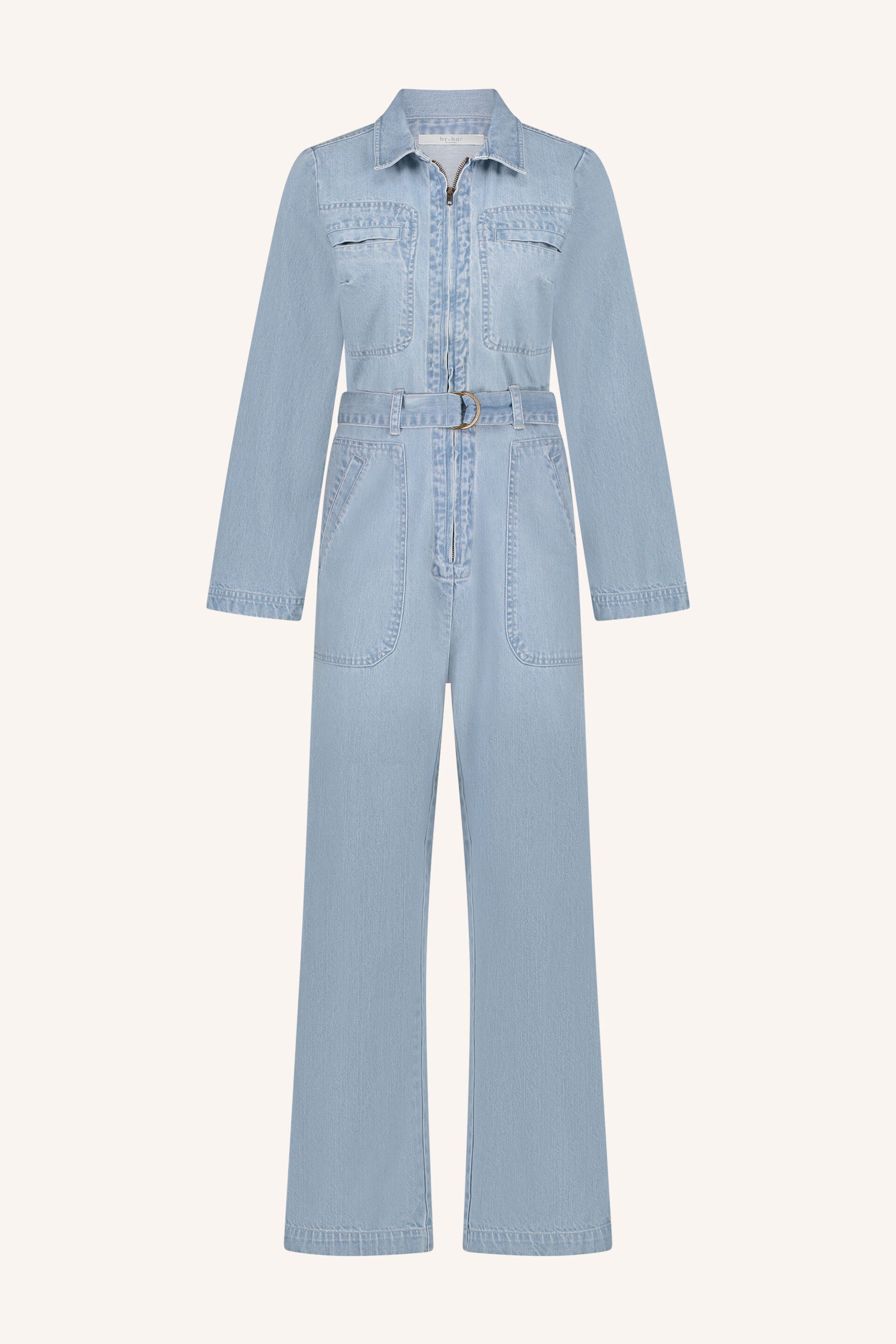 Effortless elegance in one piece! Deze heerlijke denim suit is gemaakt van een katoen kwaliteit. Deze must-have suit heeft een aansluitende pasvorm, rechte broekspijpen, twee steekzakken aan de voorkant, twee steekzakjes op de borst, een ritssluiting en hoge taille die voorzien is van een strikceintuur. De suit heeft een optimale pasvorm en creëert de perfecte go to look.