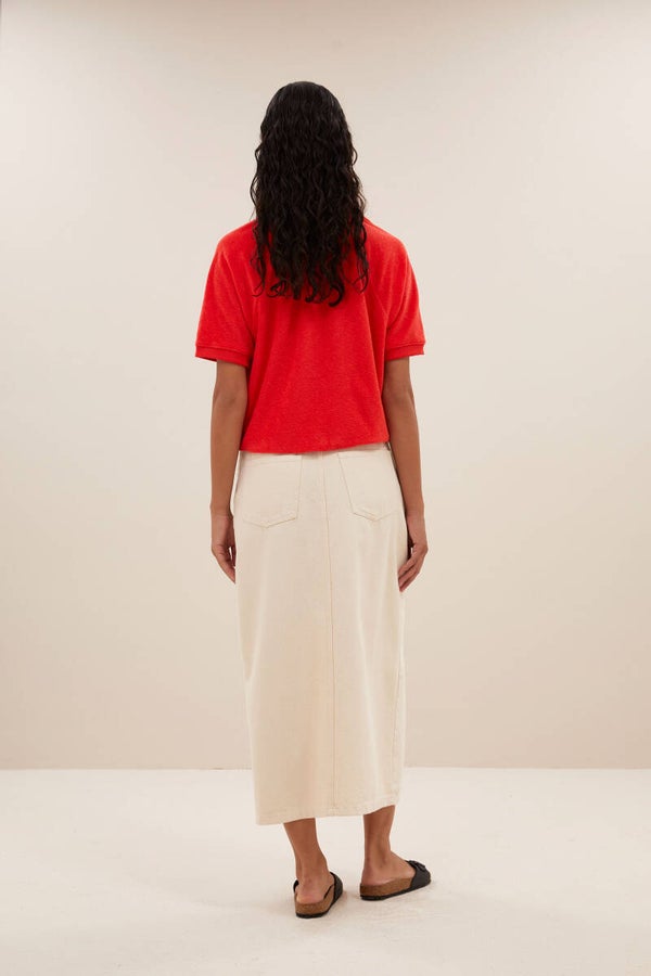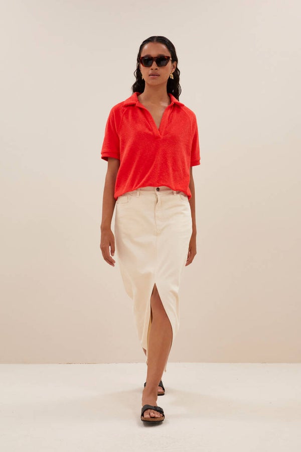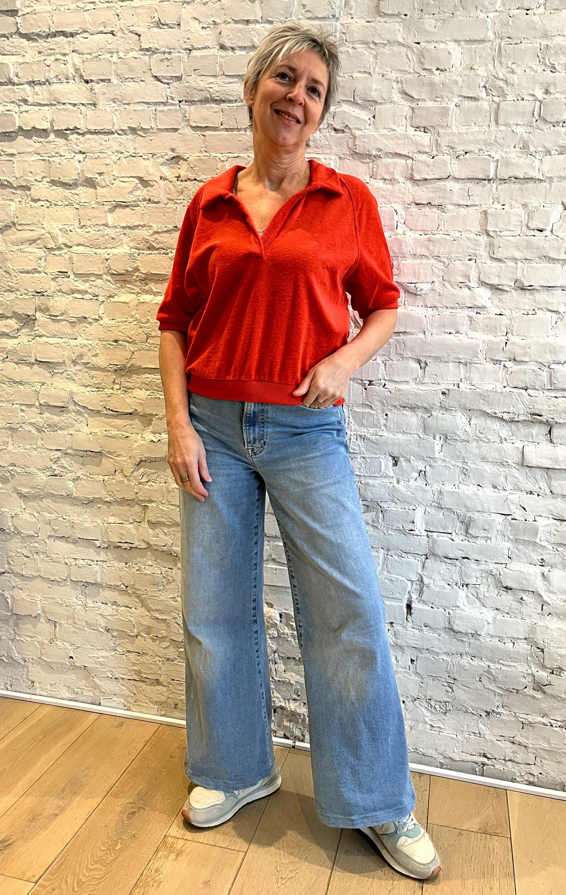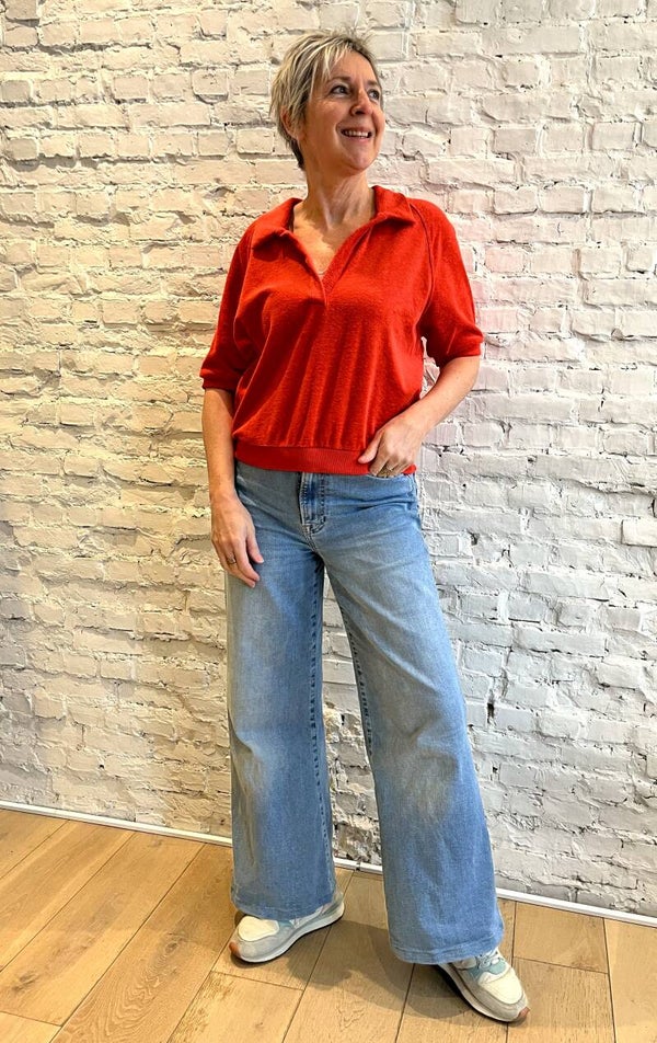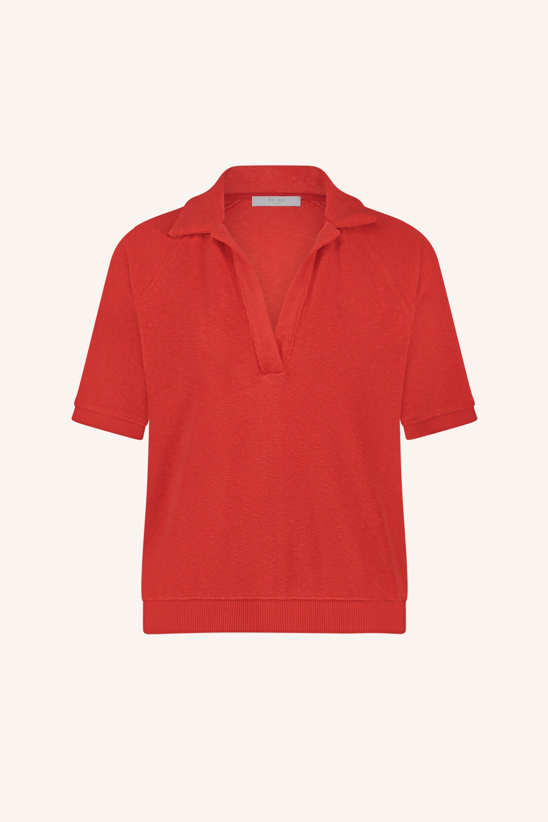 Ontdek deze superzachte rode top, gemaakt van organisch katoen. Deze comfortabele top met korte mouwen en een opstaande kraag past perfect bij je favoriete jeans voor een casual look. Ideaal voor elke gelegenheid, een essentieel item voor je garderobe.