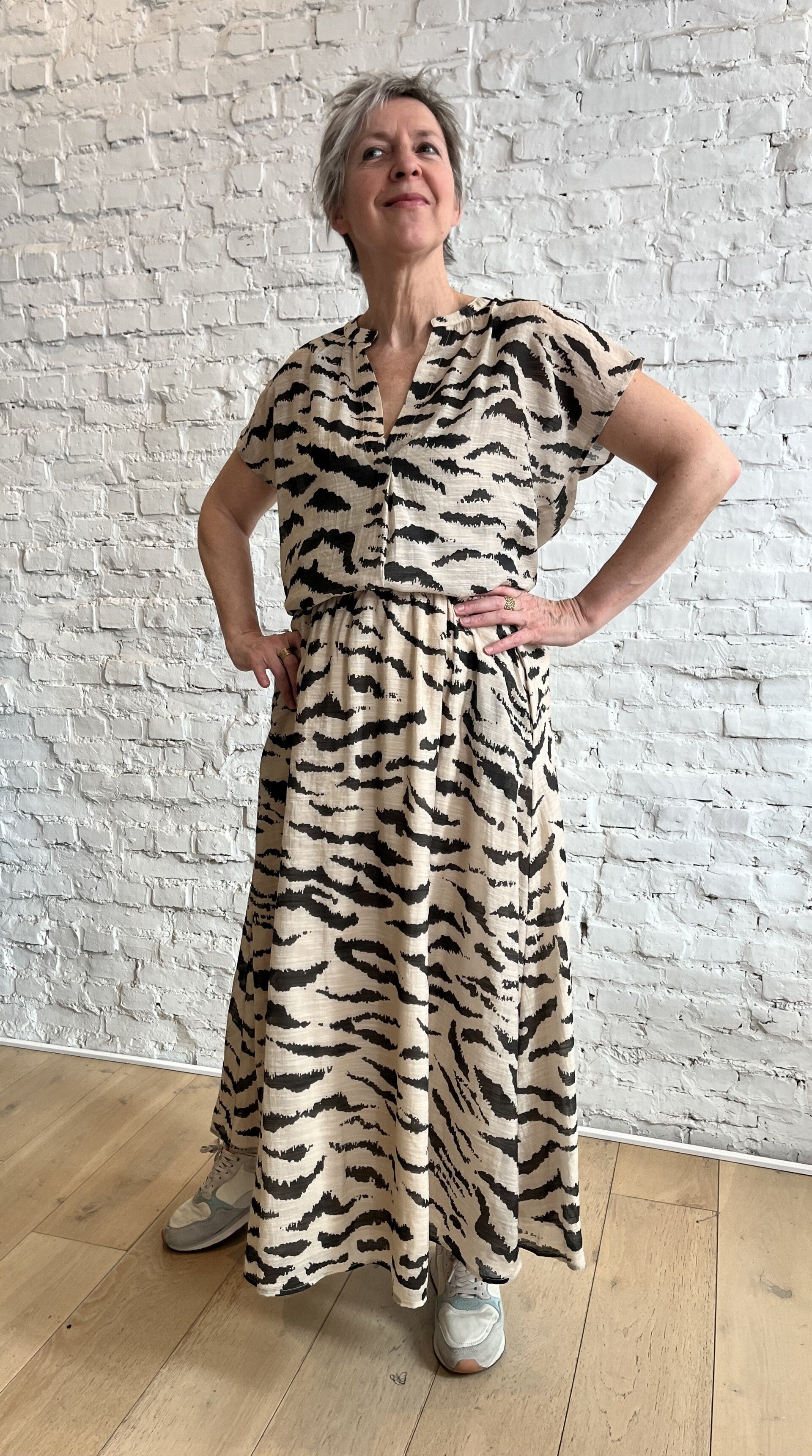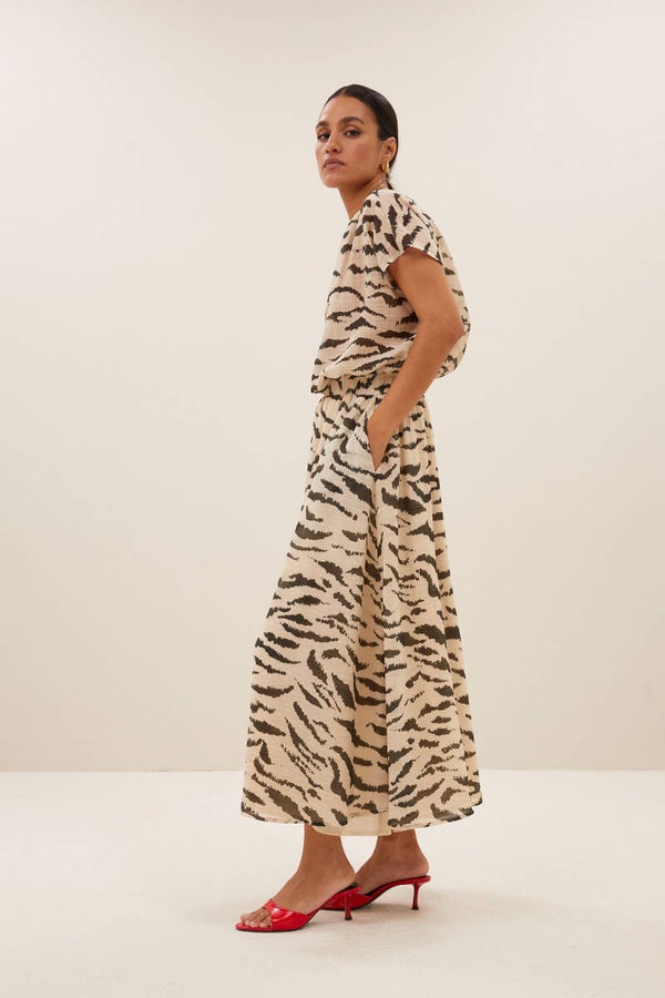 Voel je stijlvol en comfortabel in deze luchtige rok in een prachtige sand zebra print! Deze casual chic heeft een hoge taille en is perfect voor elke gelegenheid. Met verborgen steekzakken biedt hij niet alleen elegantie maar ook functionaliteit. De kuitlengte en normale pasvorm zorgen voor een moeiteloze uitstraling.