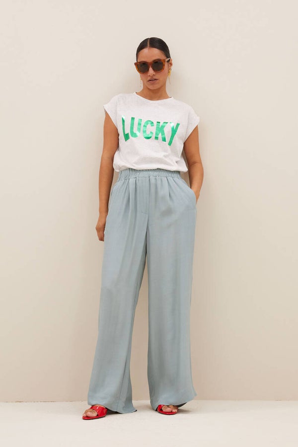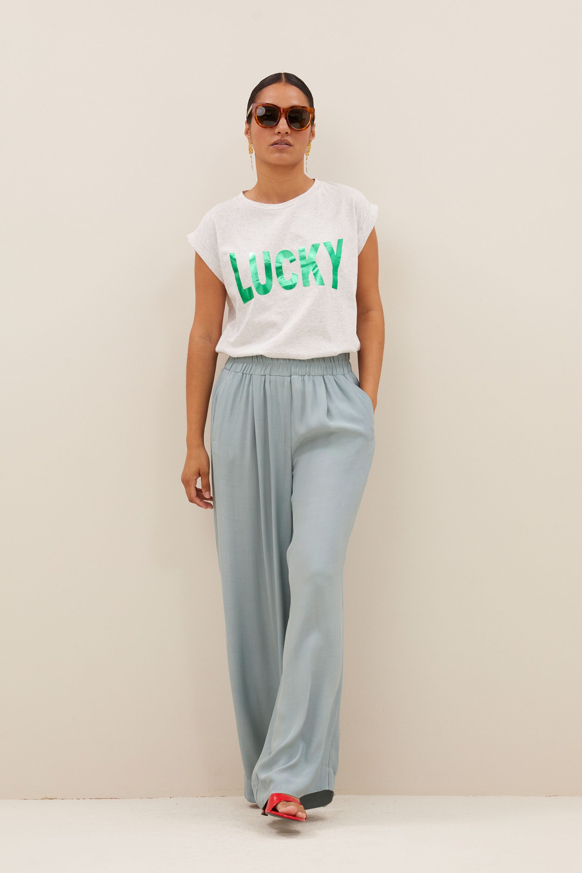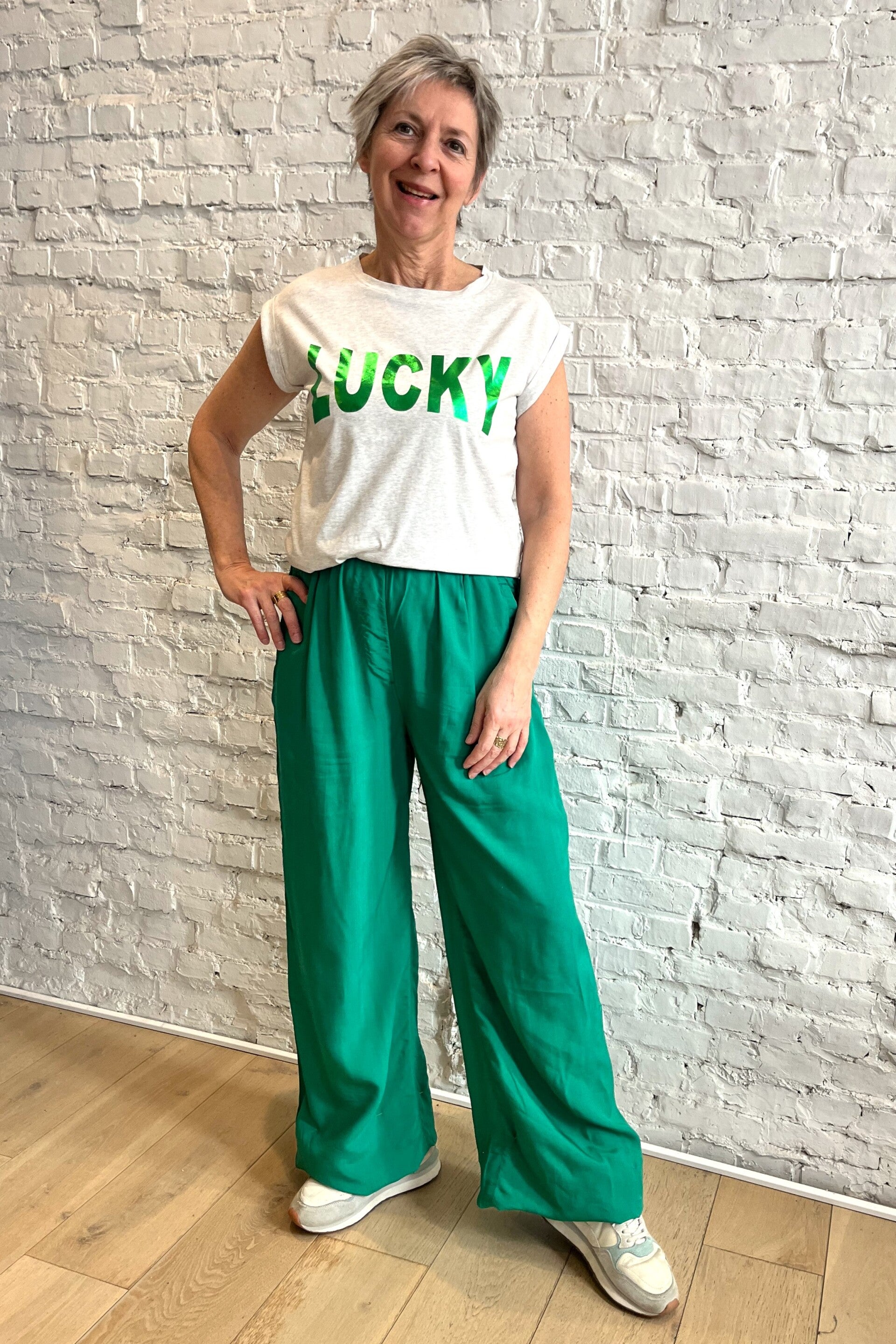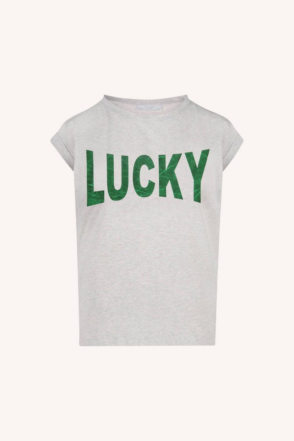 Deze t-shirt in stijlvolle lichtgrijze melee tint en shiny groene print is een echte eyecatcher! Deze casual fit top, gemaakt van organisch katoen, biedt je het comfort dat je zoekt. Met een ronde halslijn en korte mouwen is deze top perfect voor elke gelegenheid.