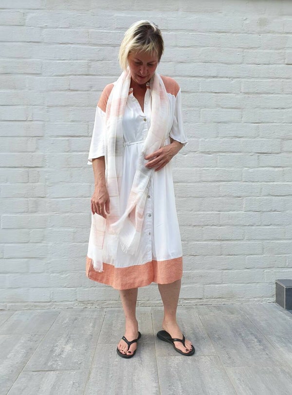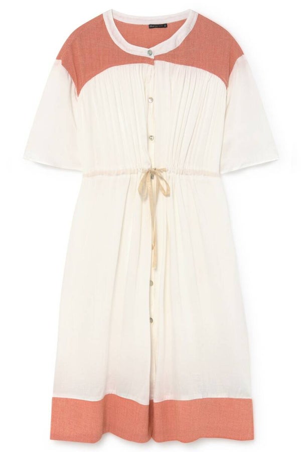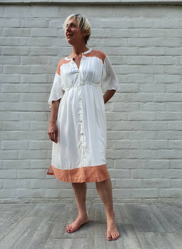 deze prachtige jurk van 90% katoen en 10%linnen heeft een koordje in de taille.