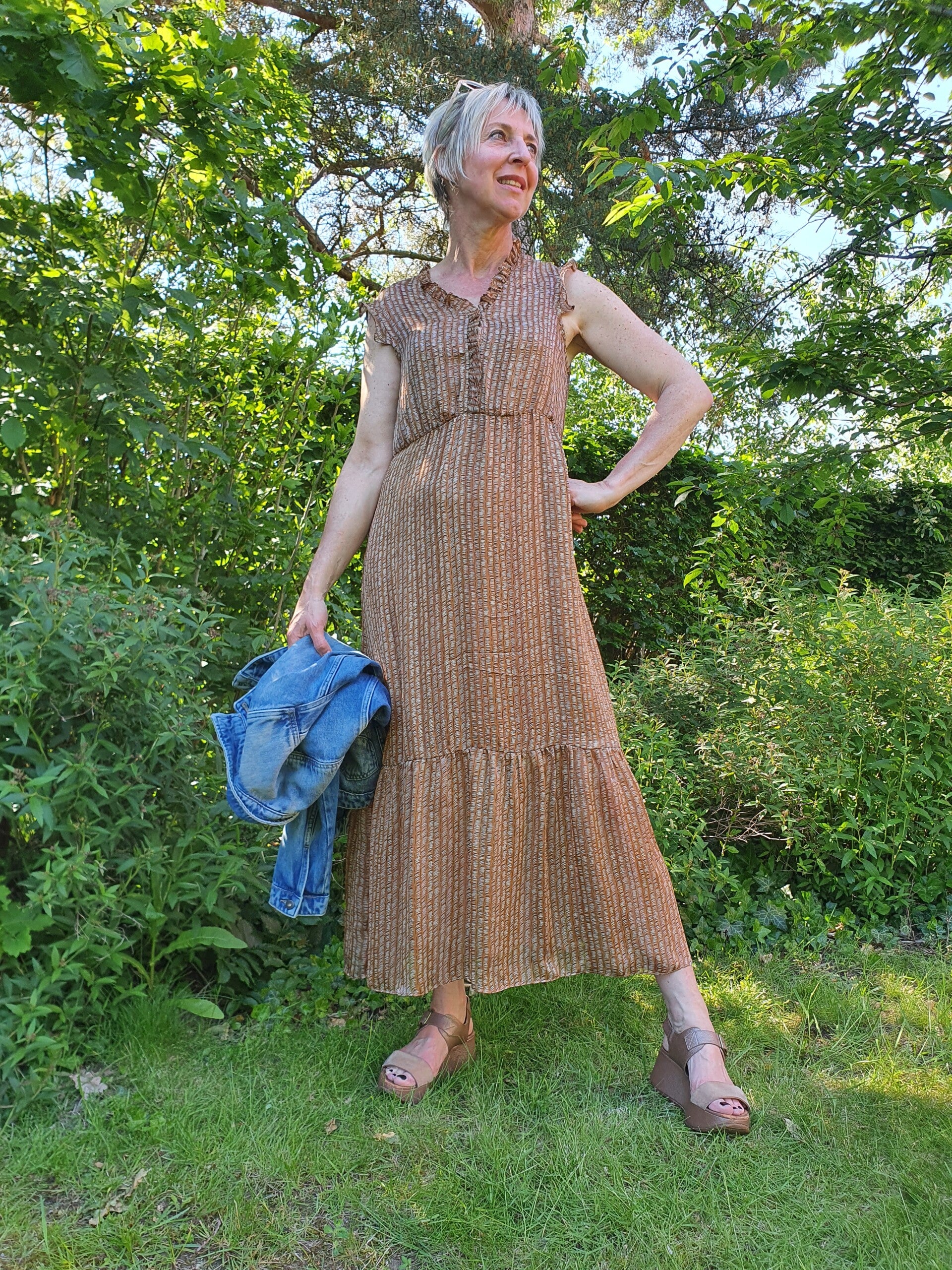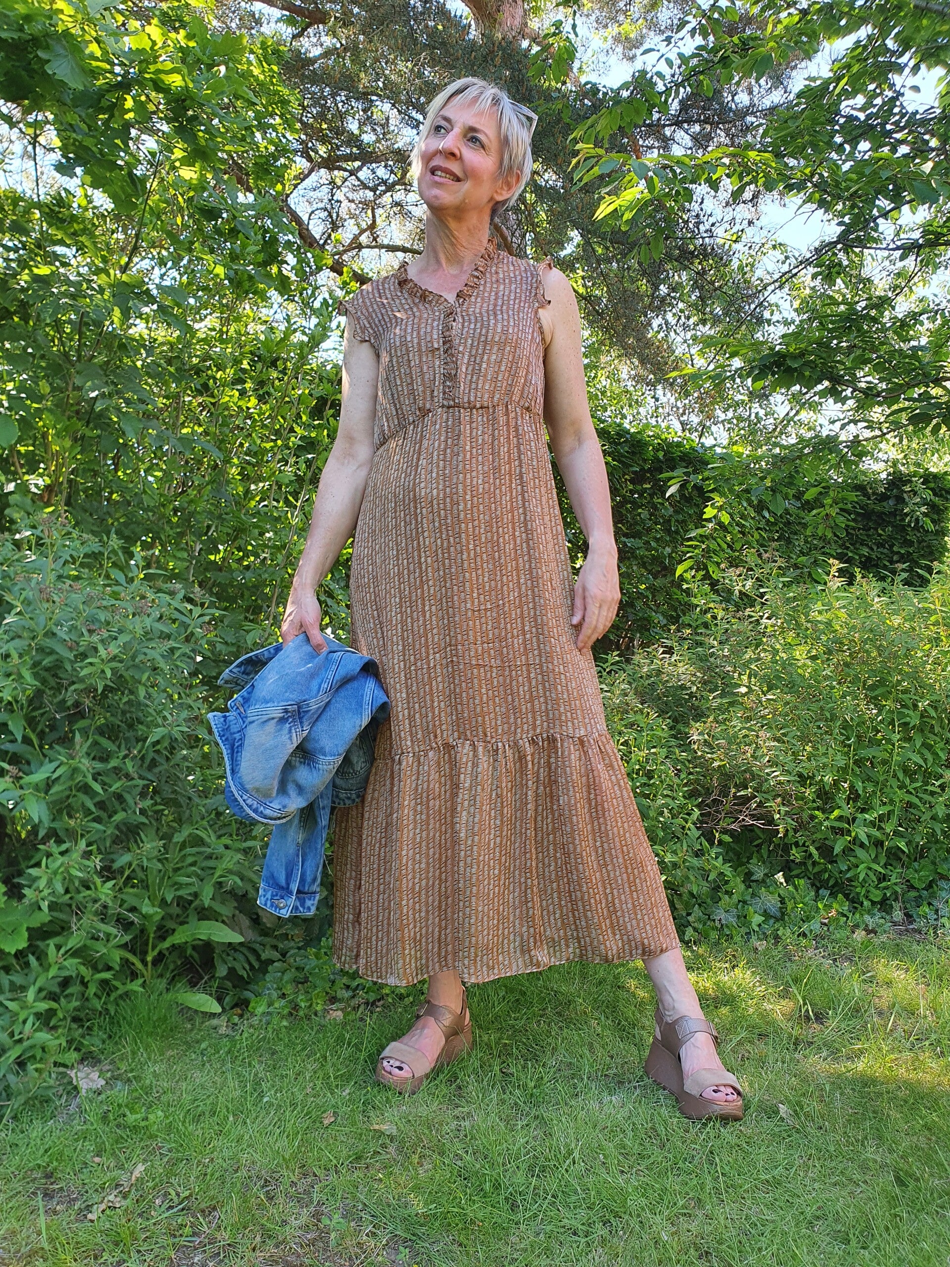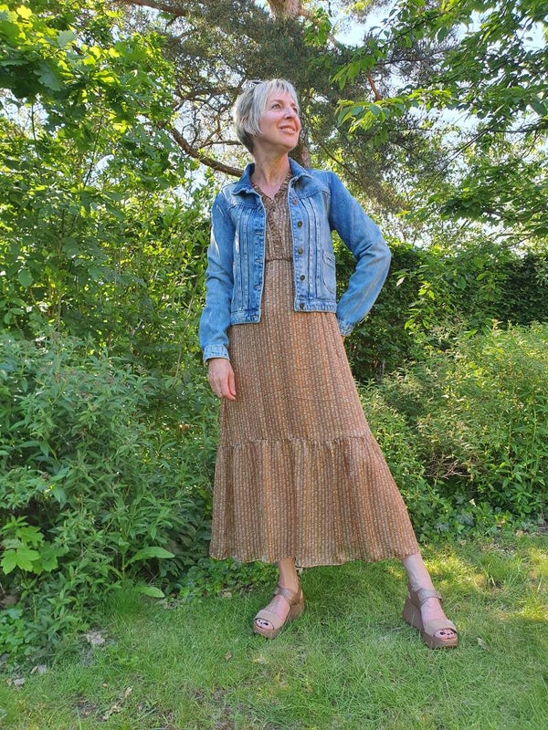 Lange bruine jurk met details in metallic + bijpassende onderjurkProductinformatie:– 100% Polyester, onderjurk 100% ViscoseWasinstructies:– Machinewas op 30 °C– Niet bleken– Plat drogen– Niet strijken– Niet chemisch reinigen
