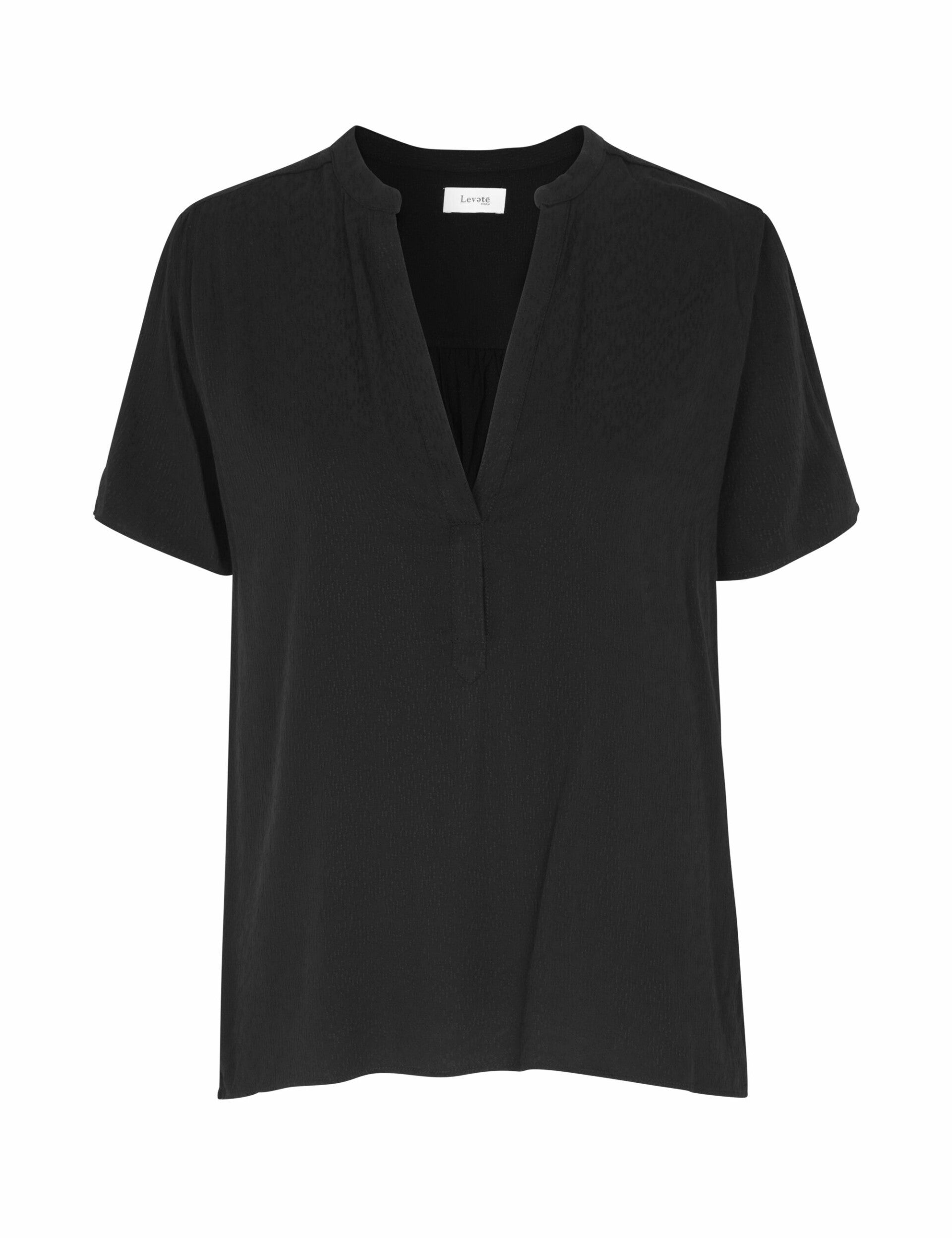 Leuke en simpele blouse in klassiek zwart. Dunne en lichtgewicht viscose kwaliteit met ton-in-ton patroon. De top heeft nette korte mouwen en mooie v-snit. Recht model met mooie heuplengte. Losse pasvorm