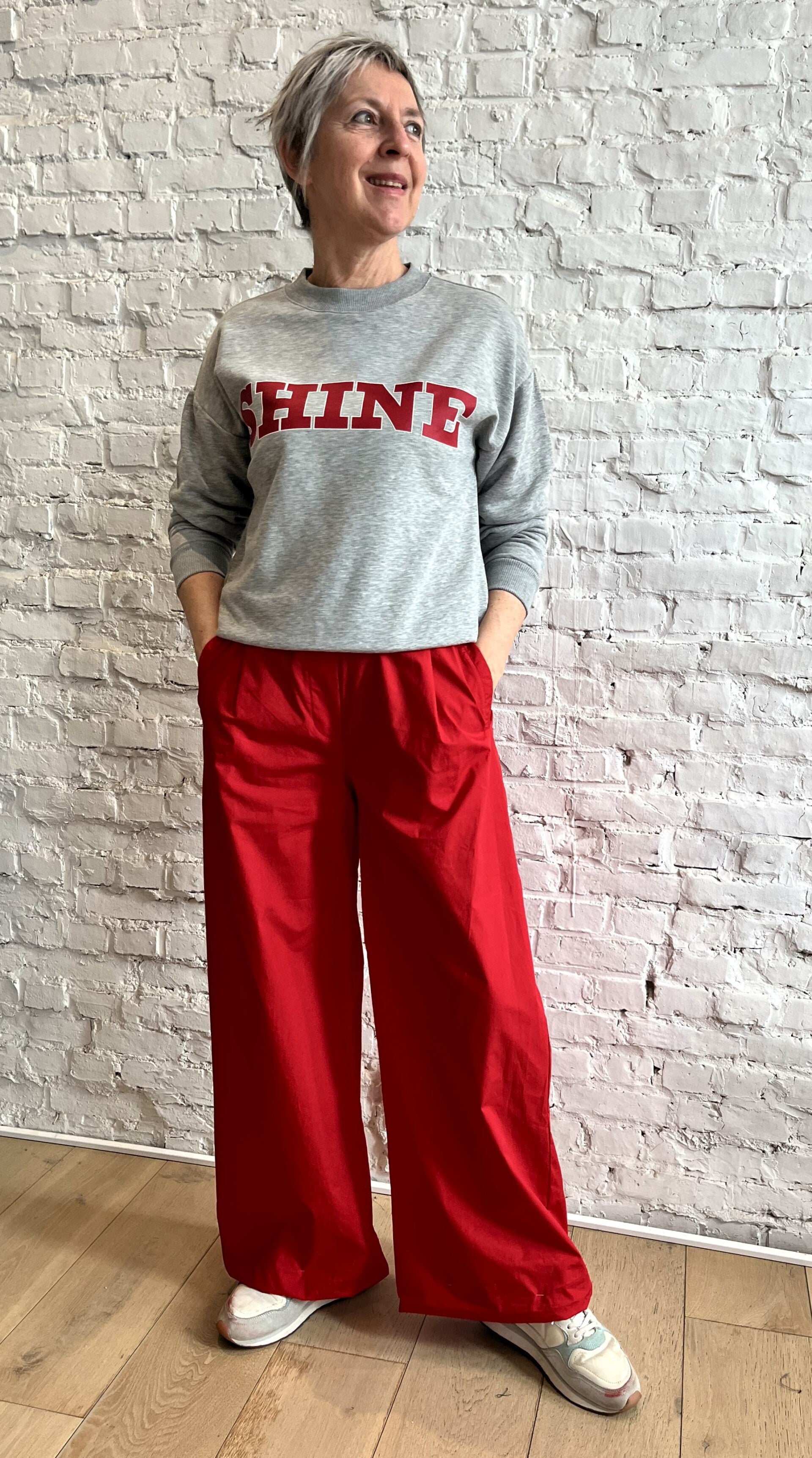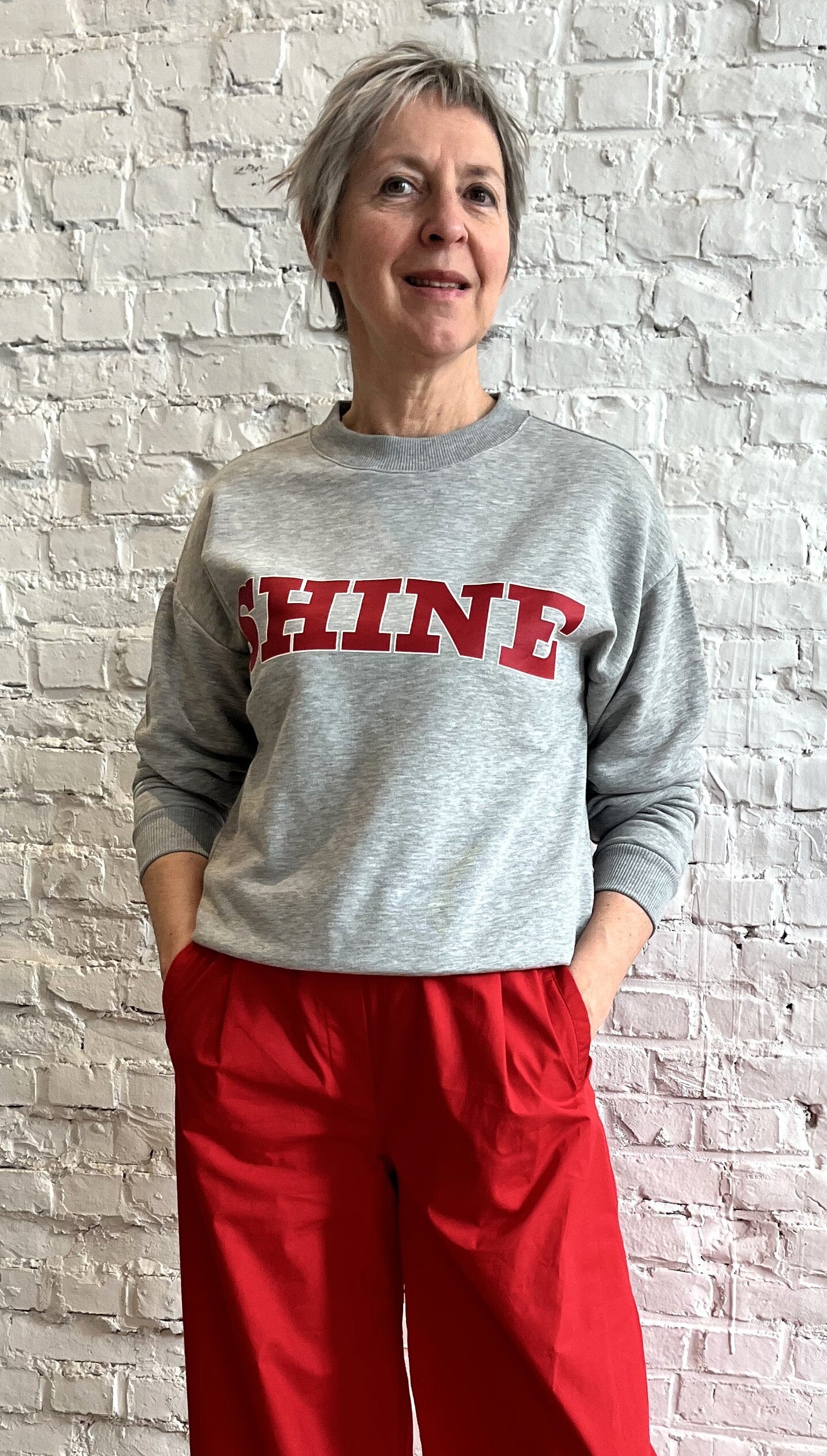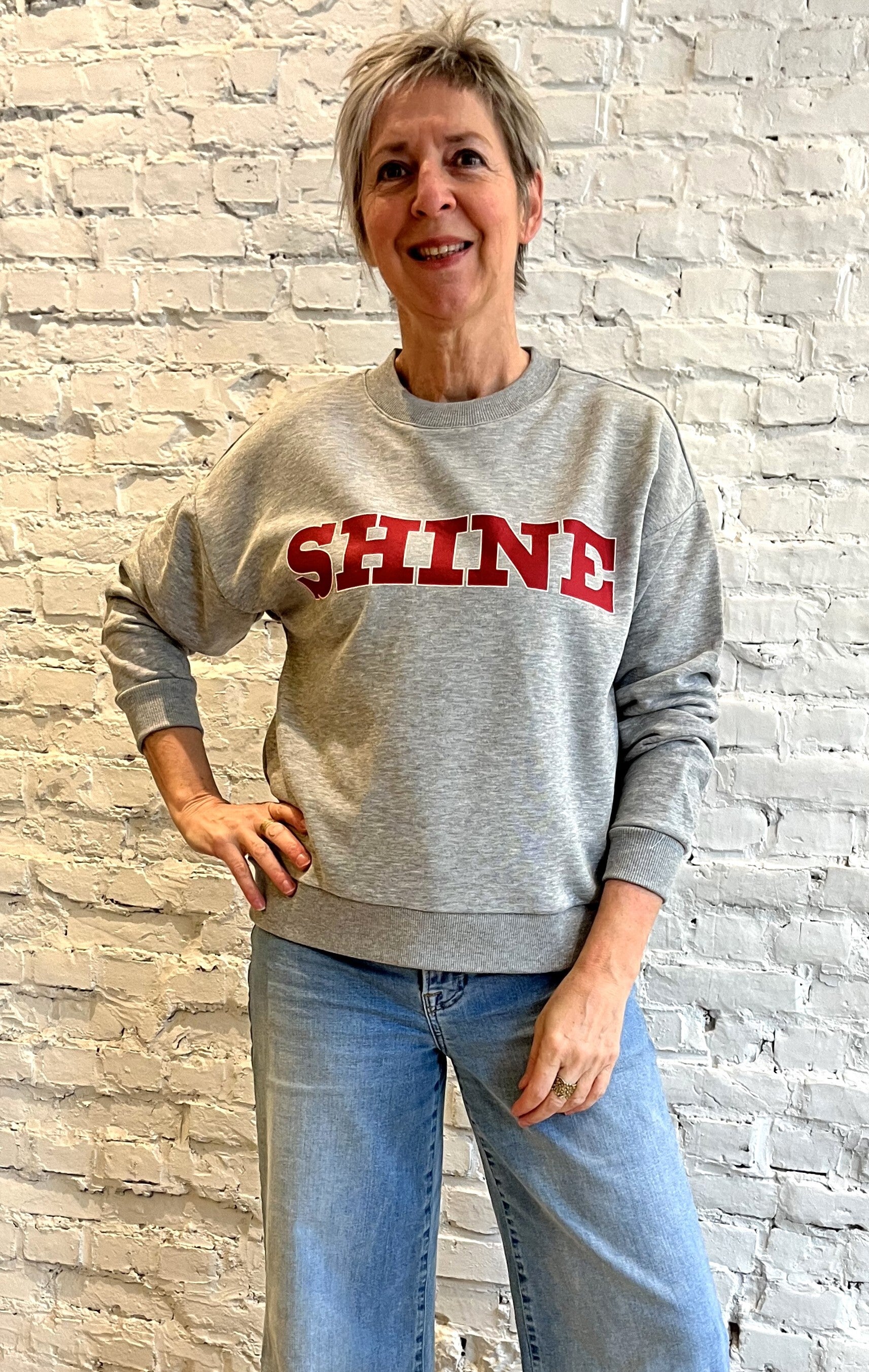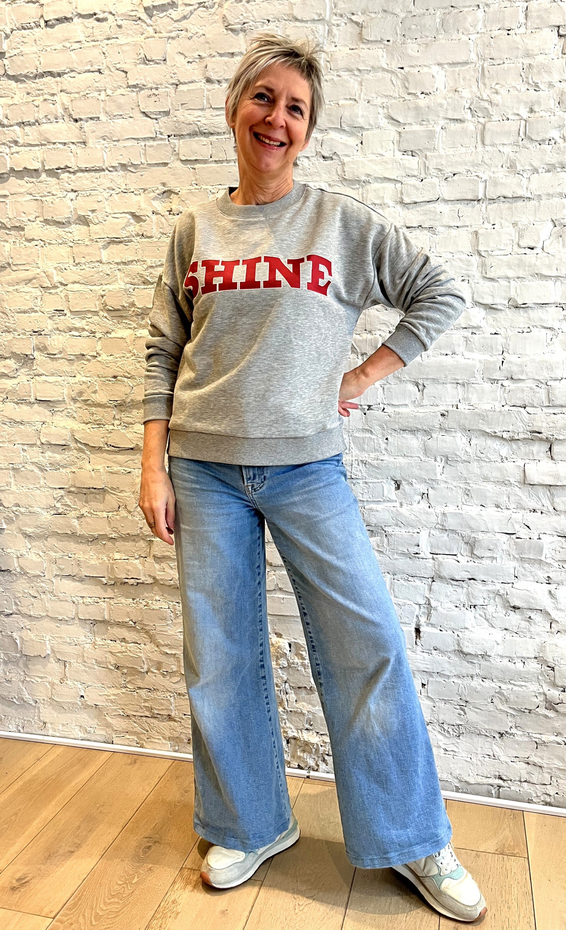 Shine whole day long met deze lichtgrijze sweater met helderrode letters. Deze trui is voorzien van een ronde hals en lange mouwen. De trui heeft een grijze kleur met een rode tekstprint op de borst. Gemaakt van 70% katoen en 30% polyester. De trui heeft elastische boorden voor de perfecte pasvorm en is makkelijk te combineren.
