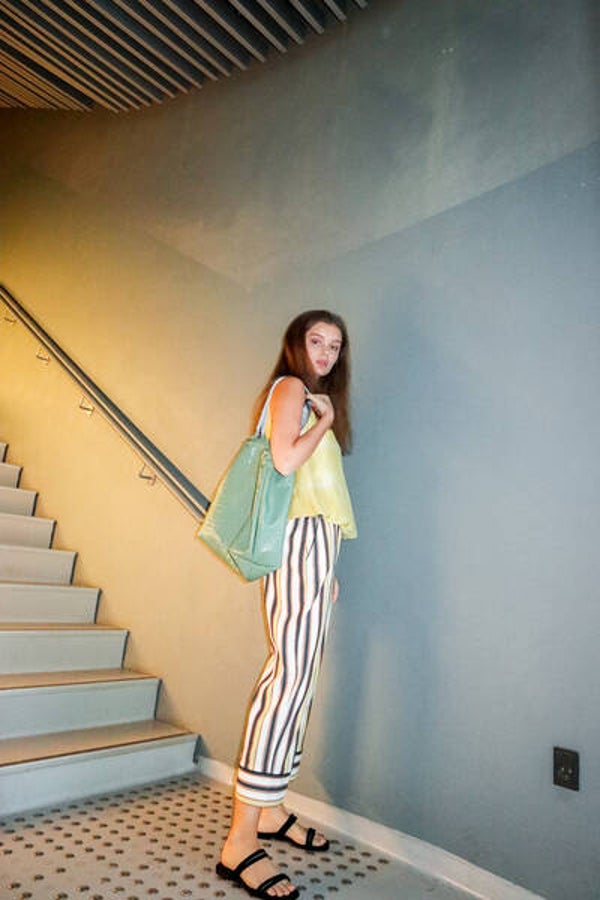 Strepenroek in katoen en polyester. De broek heeft een knoopsluiting aan de voorkant, een zak aan de achterkant en biesdetails. Kwaliteit: 25% katoen, 75% polyester