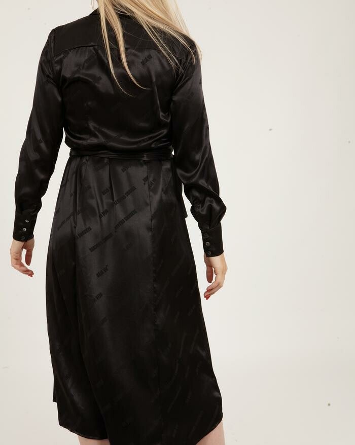 Jurk in polyester en spandex kwaliteit. De jurk heeft een kraag, knoopsluiting, wikkellook, strikband in de taille en lange mouwen. Kwaliteit: Polyester 97% / Spandex 3%