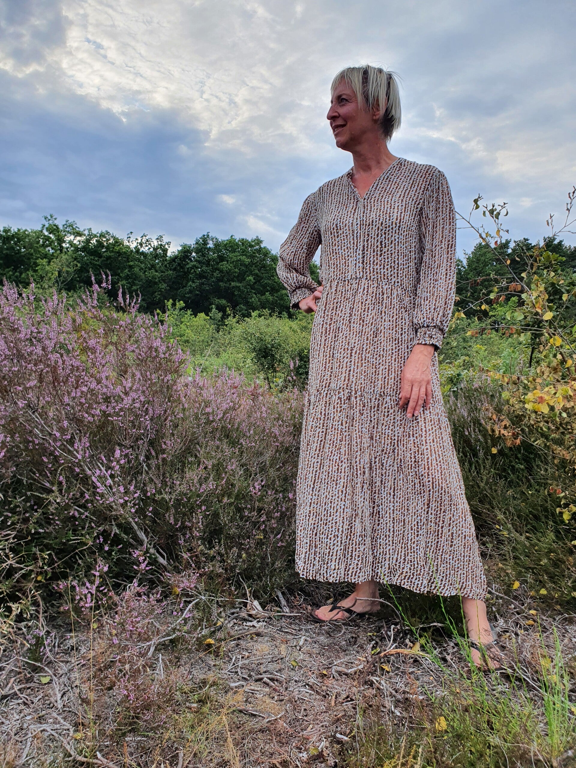 Maxi jurk in een stijlvolle print van lichtblauw, bruin, beige en gebroken wit. Het mandarijnkraagje, de 3/4 mouwen die afgewerkt zijn met het smockdetail, de zwierige stof... typeren deze stijlvolle jurk. It's all in the details!