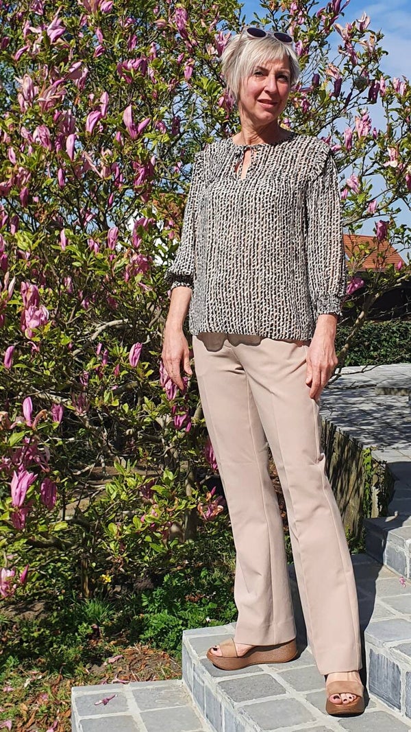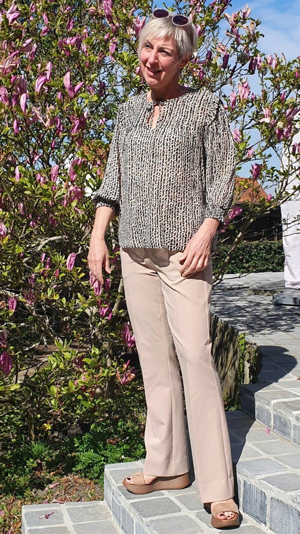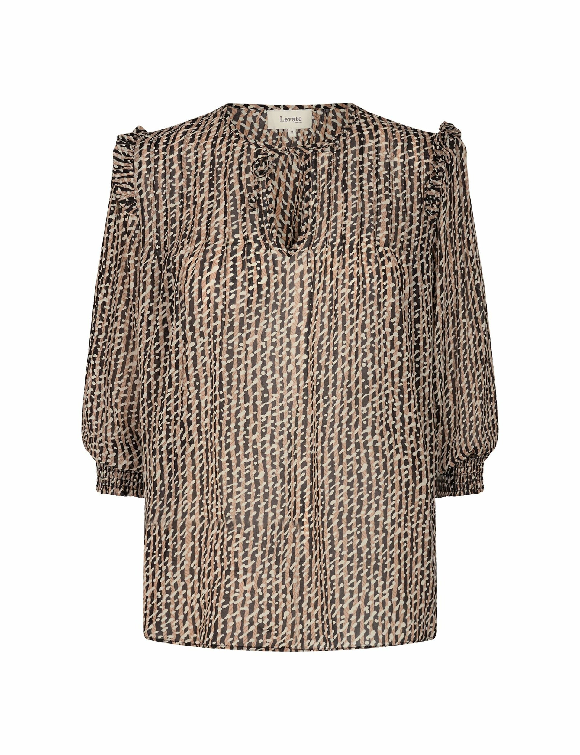 Prachtige blouse in een mix van zwart, beige en gebroken wit en bruin. Deze top heeft een fijne ruche op de schouder voor een extra vrouwelijke touch. De V-hals, de lintjes en het smockdetail aan de 3/4 mouw zorgen voor nog meer leuke details
