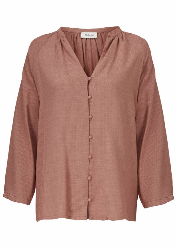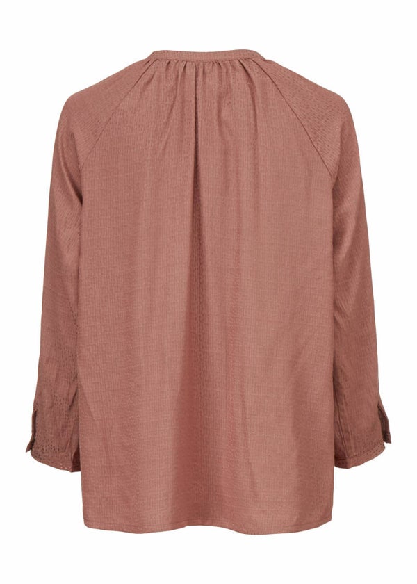 Fraaie blouse in een rosebruine kleur. De blouse is lichtglanzend, met een ton sur ton structuur in de stof.