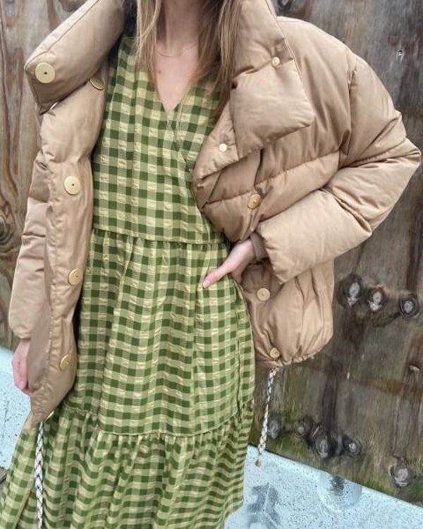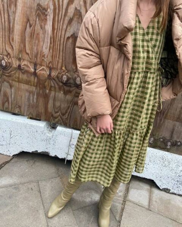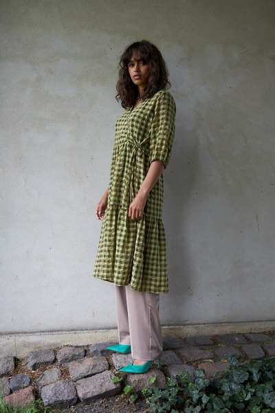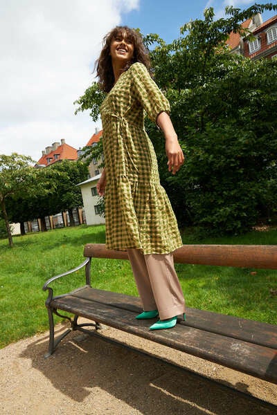 Leuke jurk met groene ruiten die gemakkelijk gestyled kan worden naargelang de gelegenheid. De jurk is lang, heeft halflange mouwen en een V-hals.