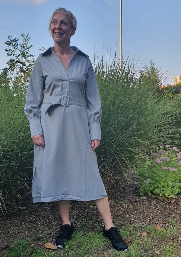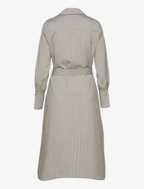 Deze stijlvolle groengrijze jurk heeft een fijn strepenpatroon en lange mouwen.