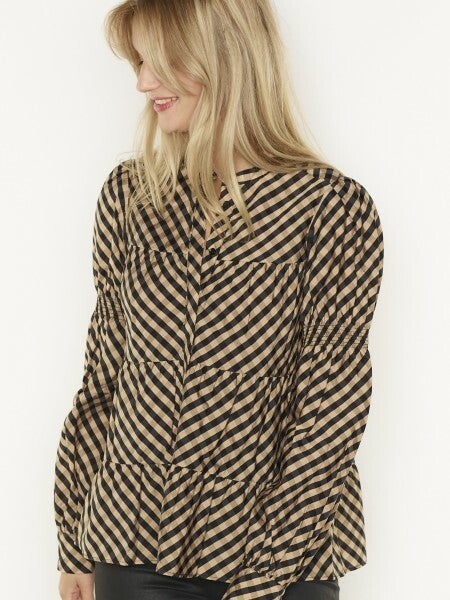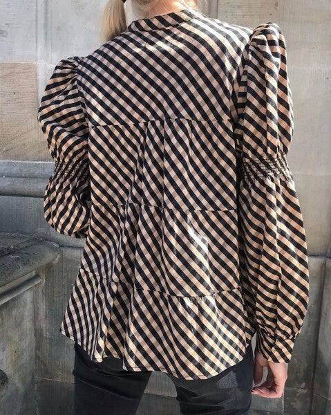 Bruin/zwarte ruitjesblouse met verborgen knoopjes aan de voorkant Lichte ruches op de schouder, elastische band en manchetten met knopen